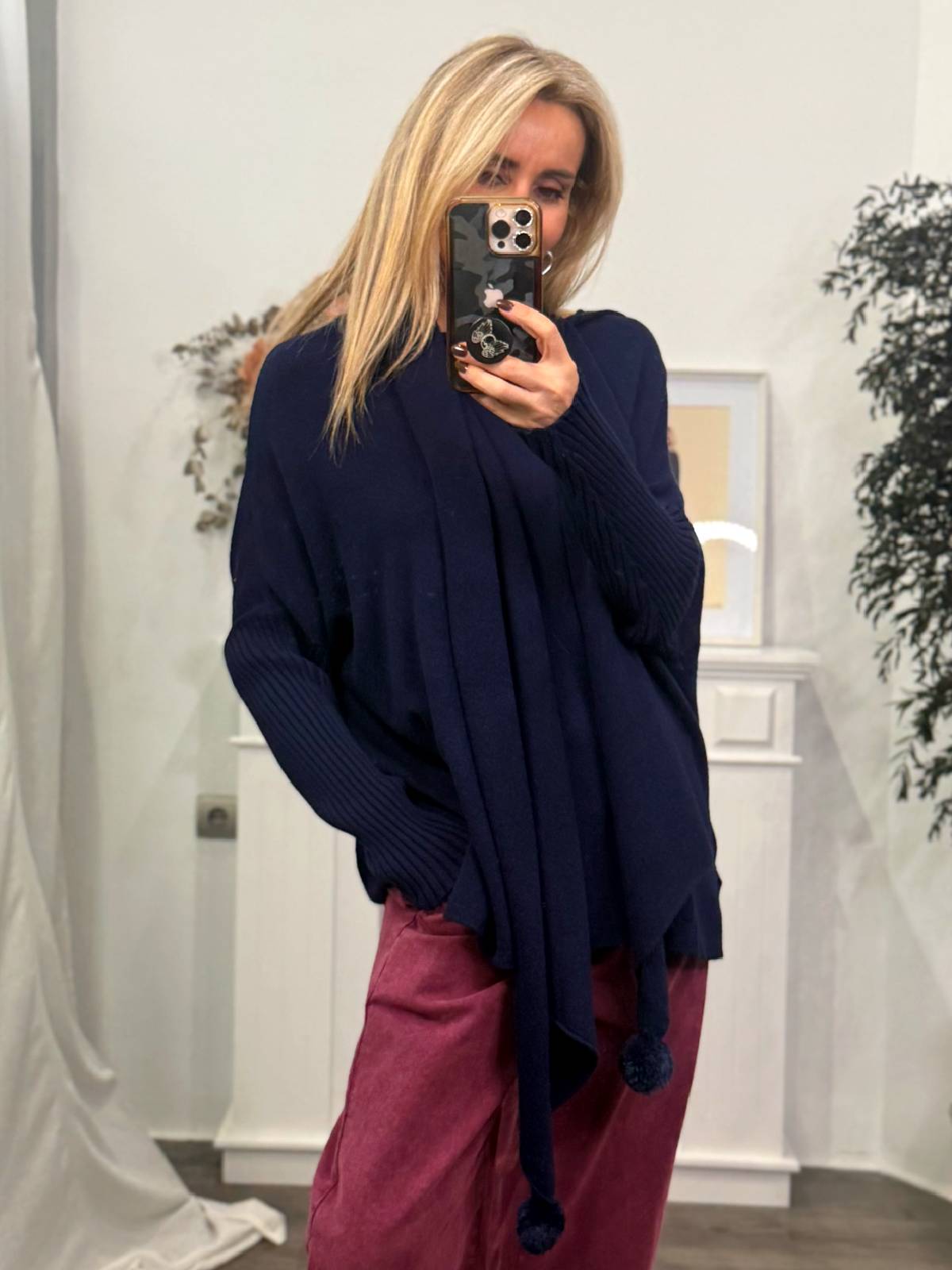 Jersey oversize de punto con cuello de barco, manga murciélago con detalle de canalé- Detalle de bufanda del mismo color. Composición: 35% modal, 25% viscosa, 20% nylon, 15% poliéster, 5% lana.