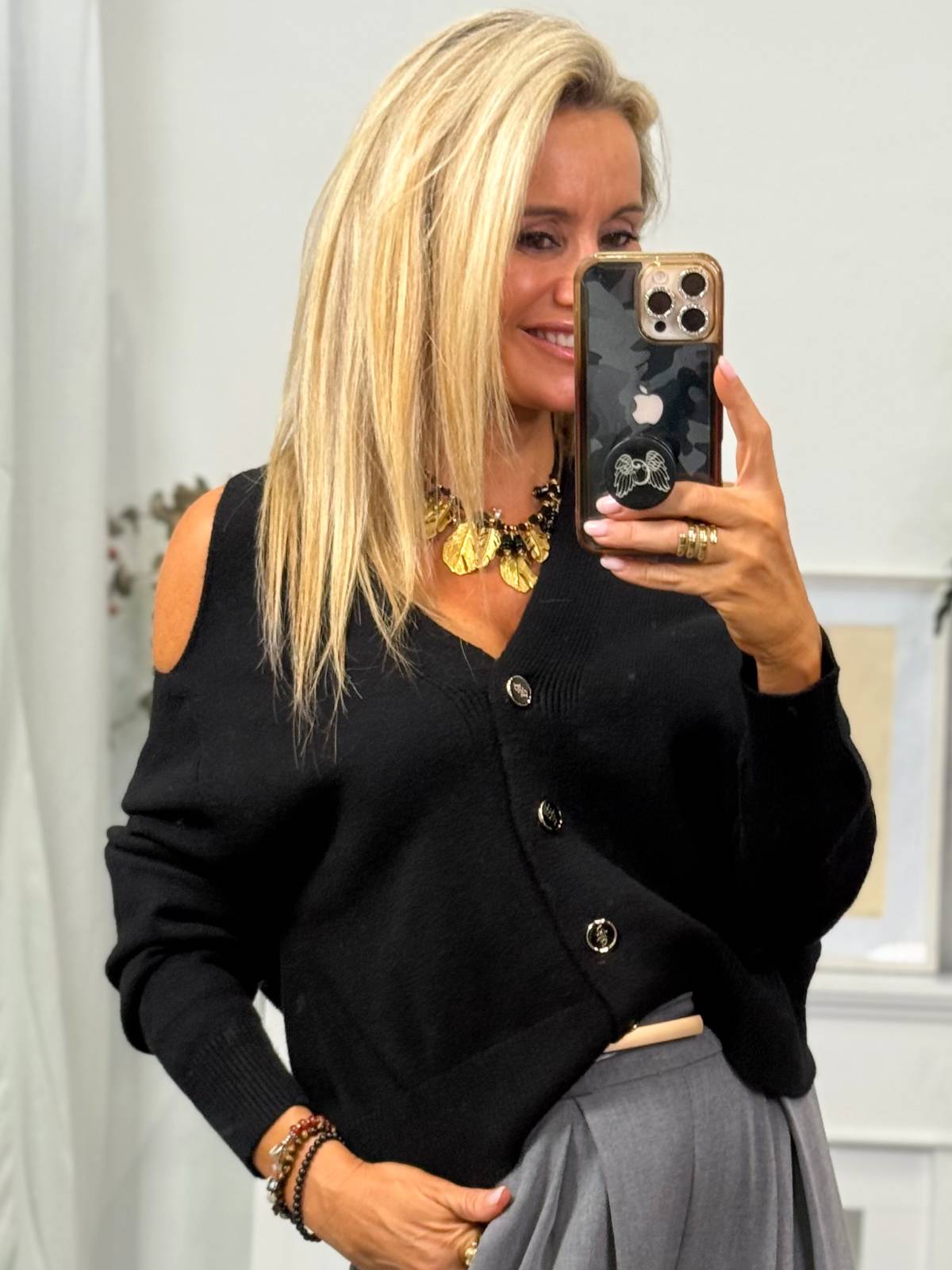 Jersey de punto con hombros cut out. Cierre central con botones negros y logo de la marca en dorado. Escote en pico. Puños y bajo de canalé. Composición: 50% Viscosa, 27% Poliéster, 23% Nylon