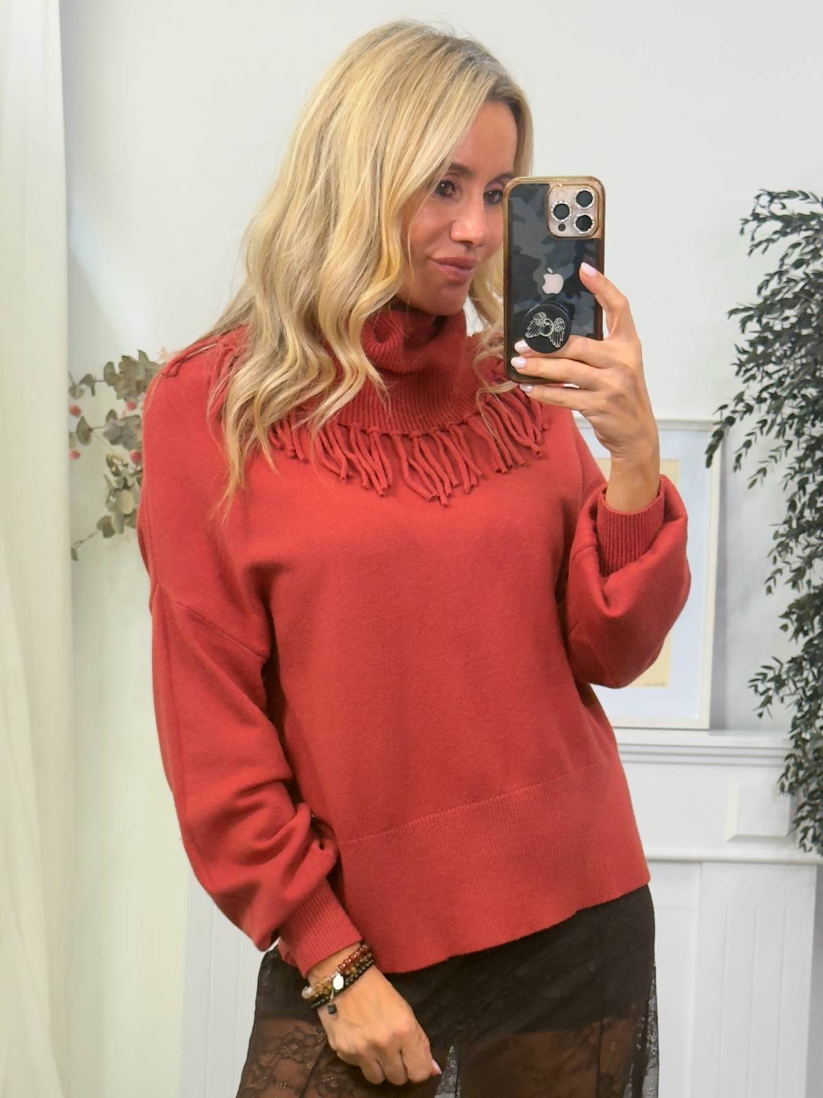 Jersey de punto color teja con cuello alto de canalé y flecos en el borde. Puños y bajo de canalé. Composición: 50% Viscosa, 27% Poliéster, 23% Nylon.