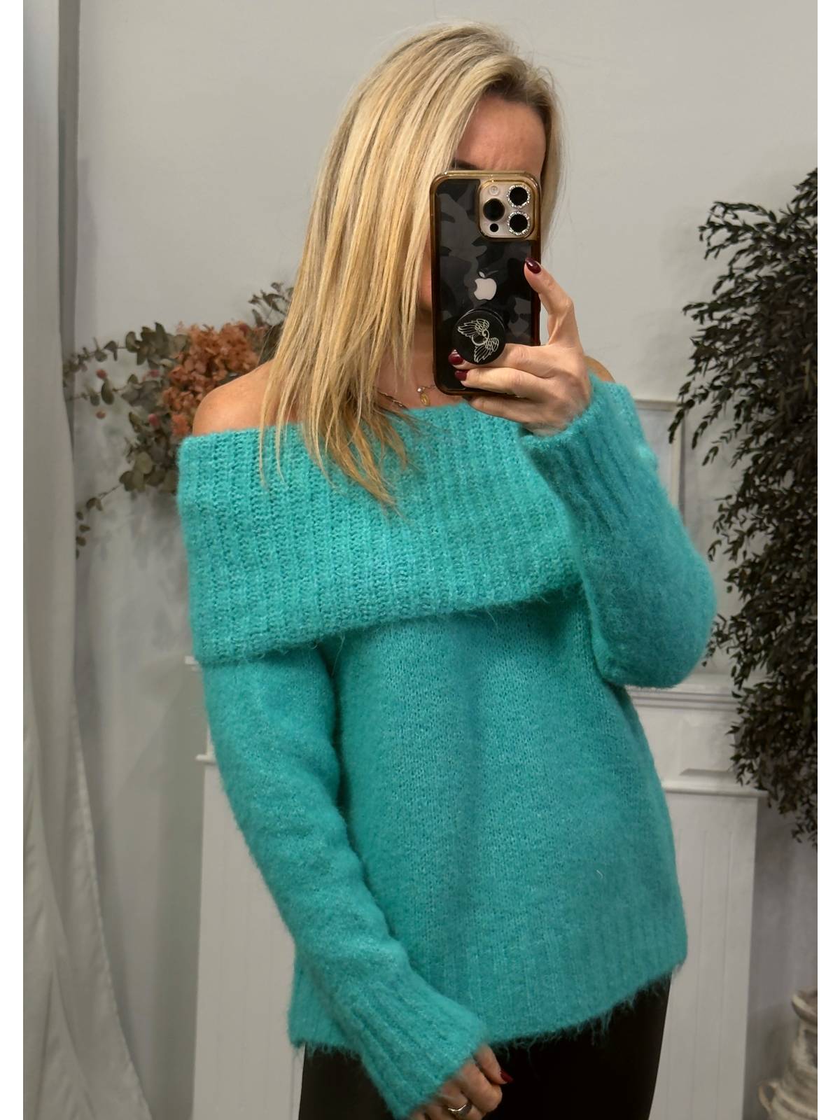 Jersey de punta y manga larga con escote bardot. Composición: 49% recycled, 16% poliéster,15% nylon, 10% lana, 8% acrílico, 2% elastán.