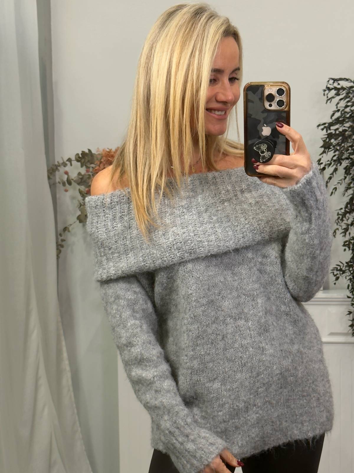 Jersey de punta y manga larga con escote bardot. Composición: 49% recycled, 16% poliéster,15% nylon, 10% lana, 8% acrílico, 2% elastán.