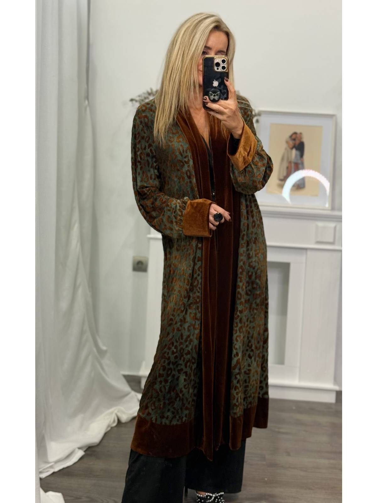 Kimono largo de terciopelo con estampado animal print. Ribete del cuello en terciopelo marrón. Composición; 95% poliéster, 5% elastán.