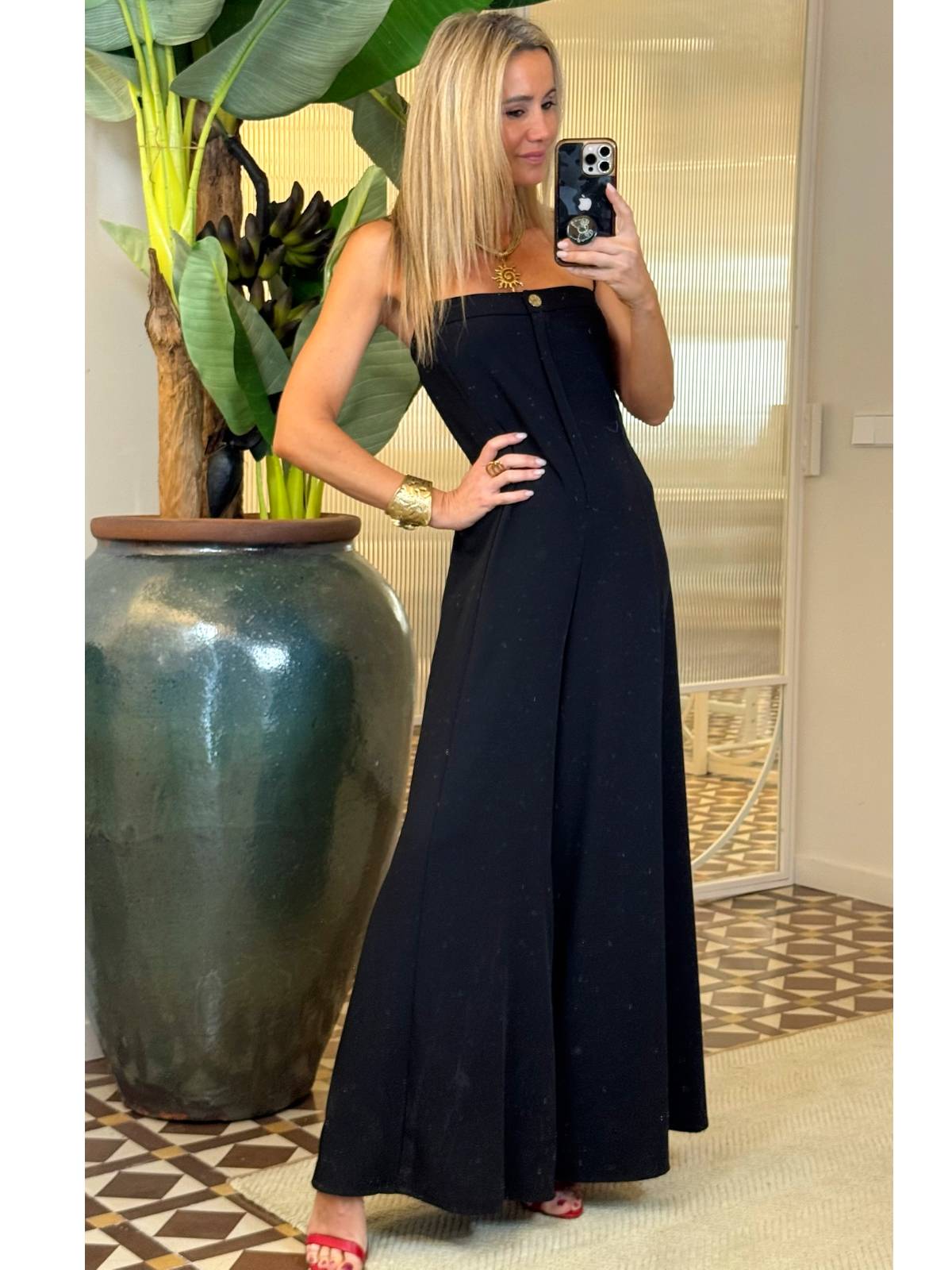 Mono negro palazzo con escote palabra de honor con tirantes simulando pantalón con cierre delantero de cremallera y botón. Composición: 96% poliéster, 4% elastán.
