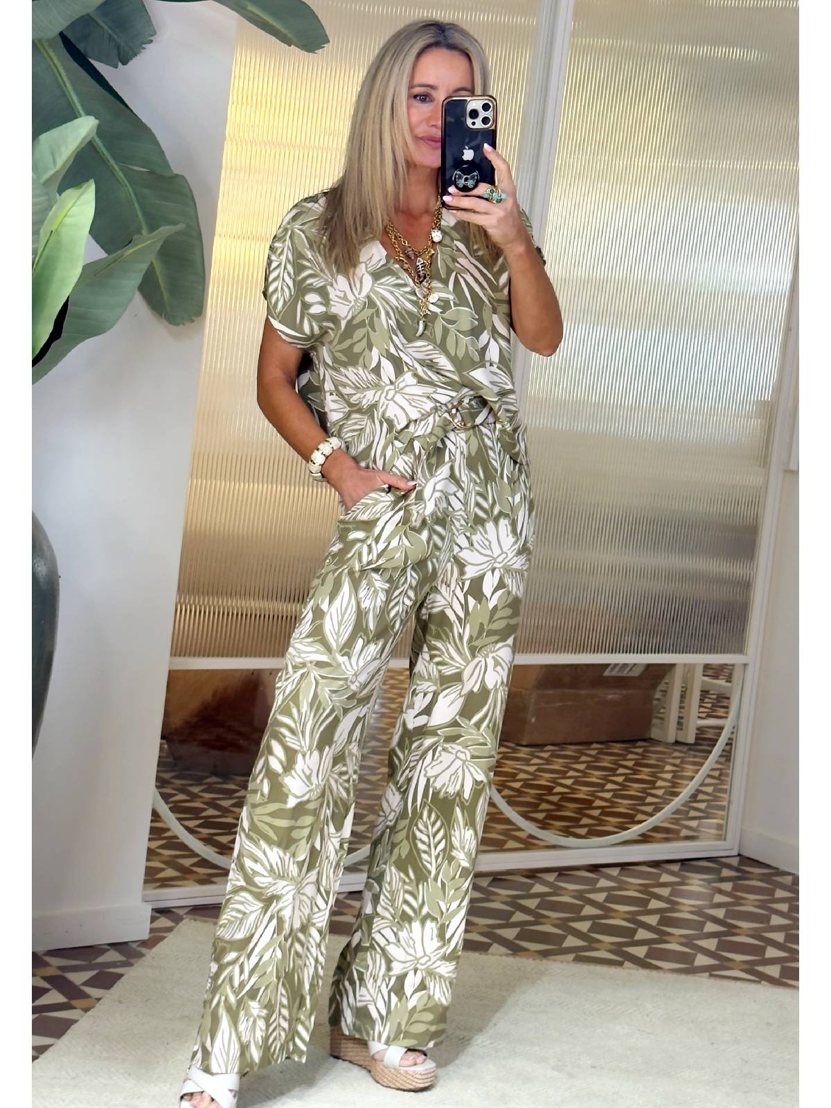 Mono de sarga estampada con cuello en V, manga corta, bolsillos en los laterales y cinturón a juego. Composición: 100 % viscosa.