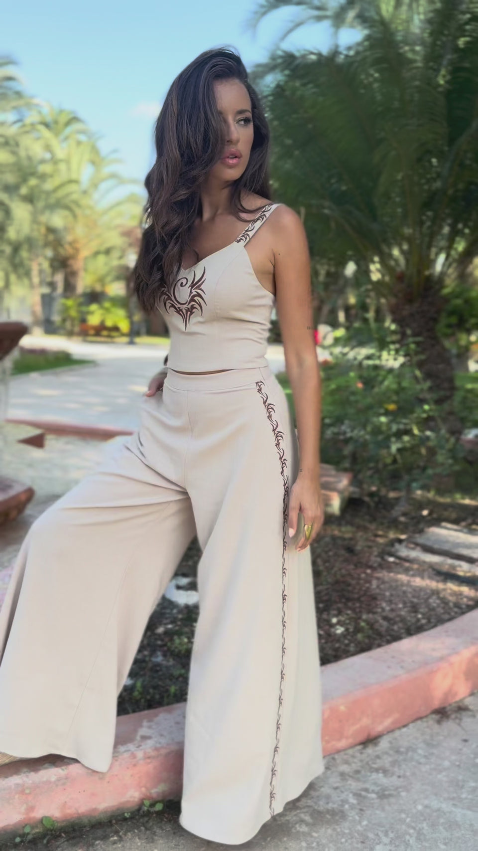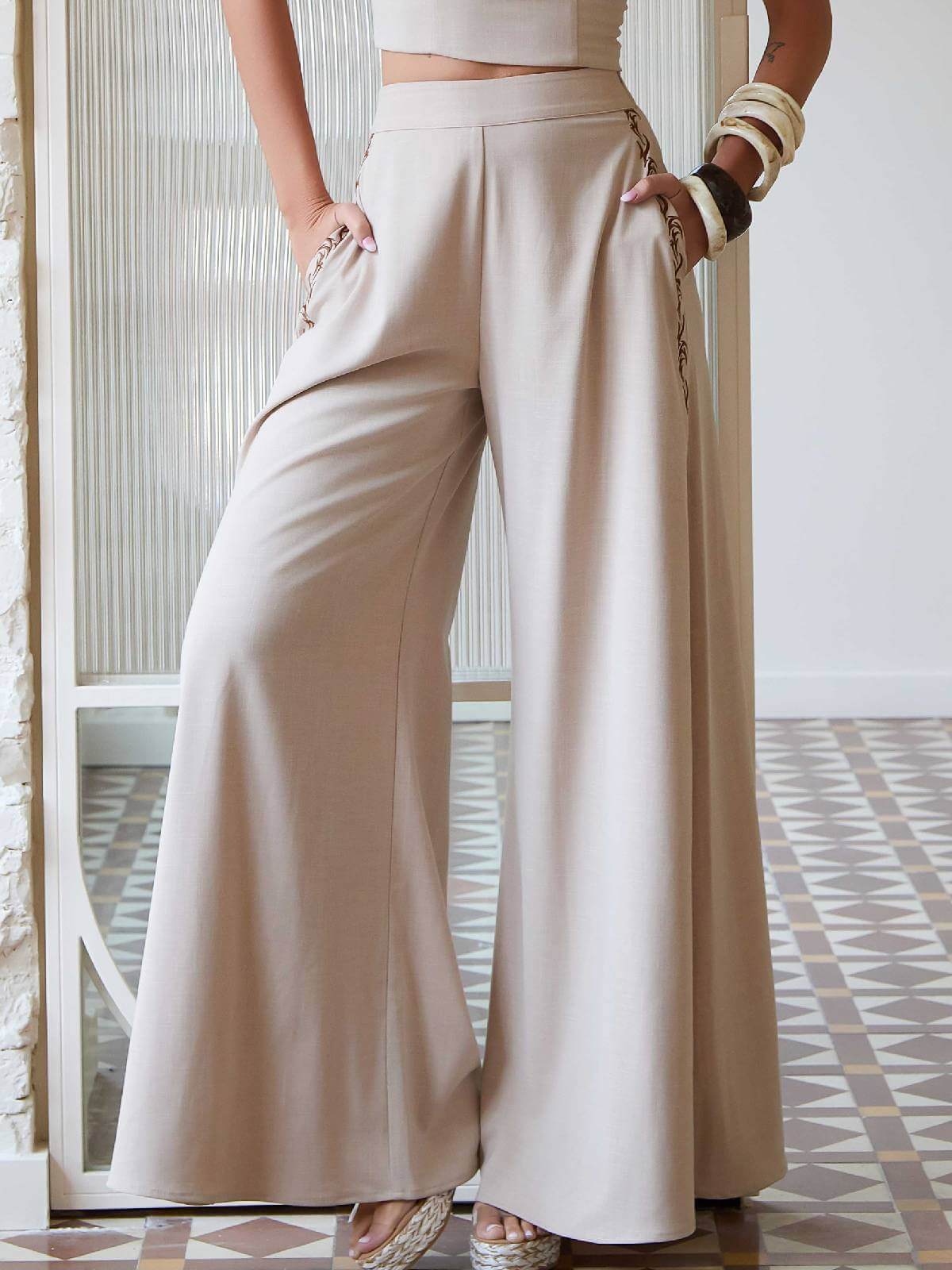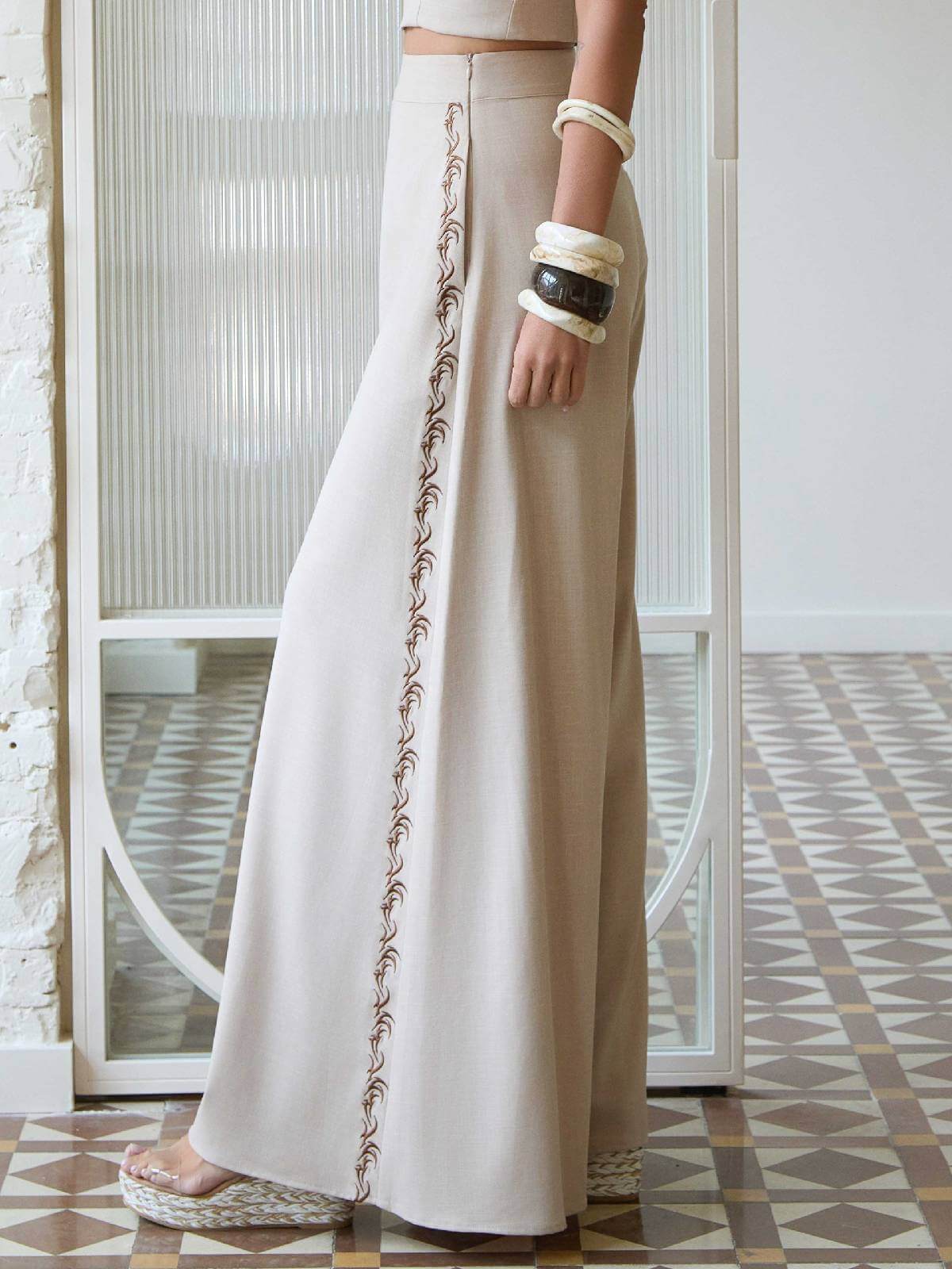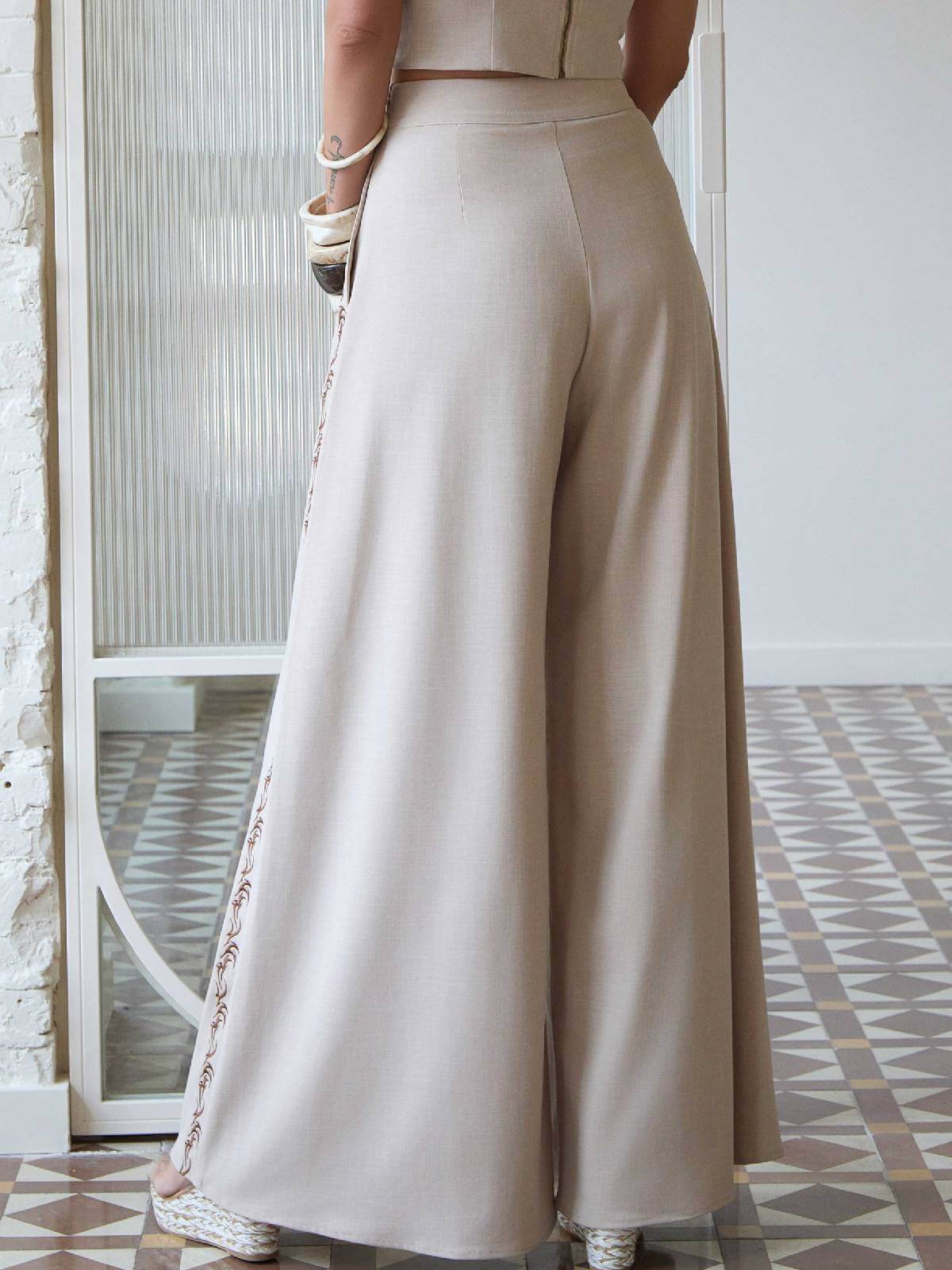 Pantalón ancho fluido de efecto lino en color beige, de tiro alto con cinturilla y laterales con bordados en marrón chocolate. Se abrocha en un lateral con cremallera invisible.