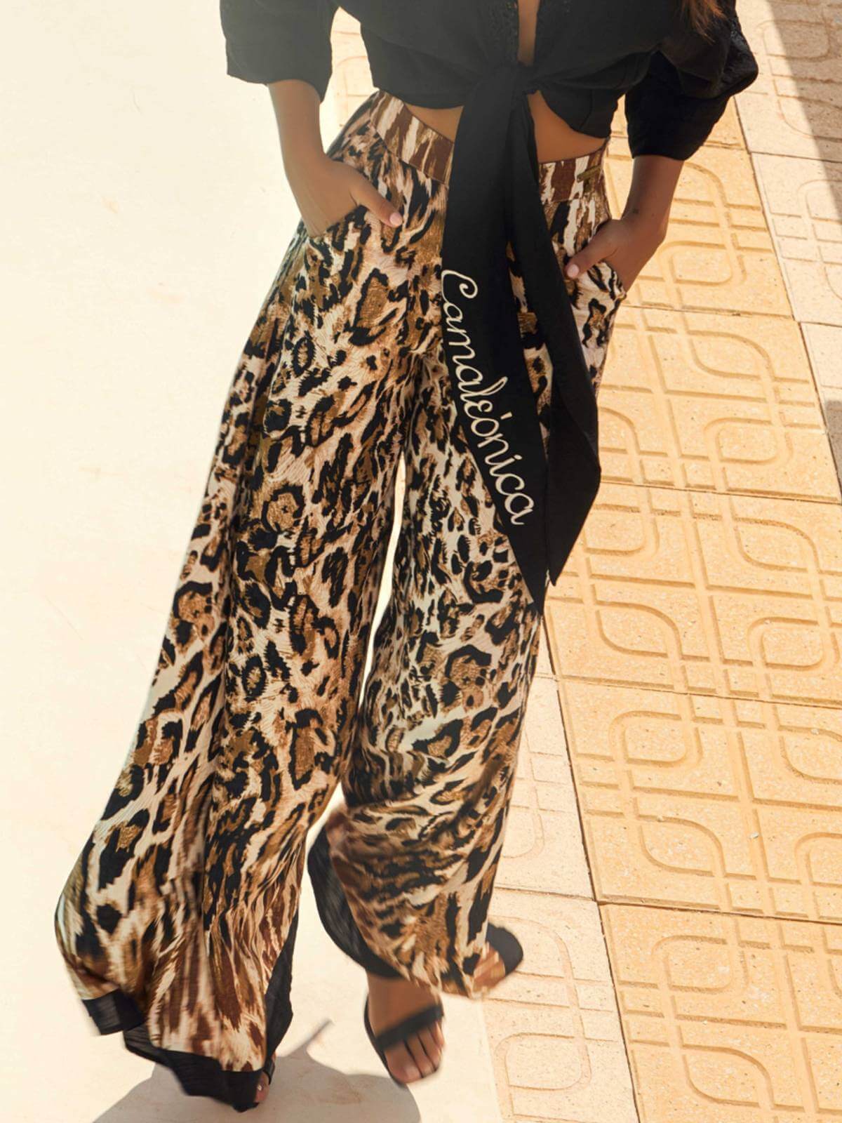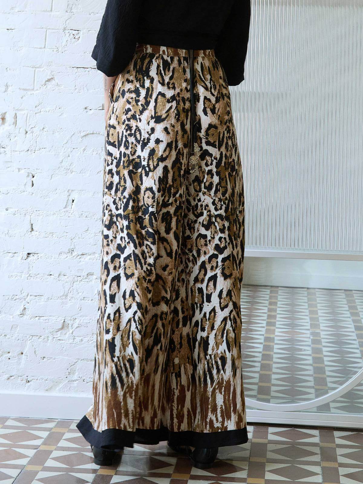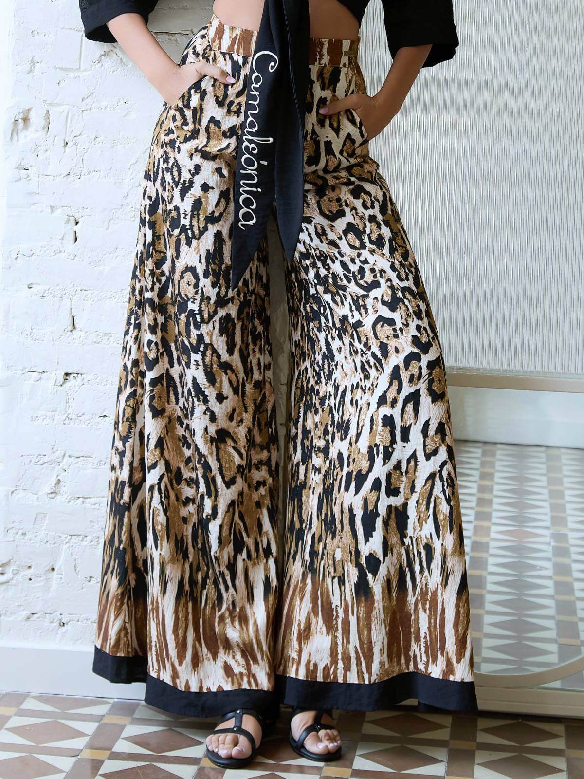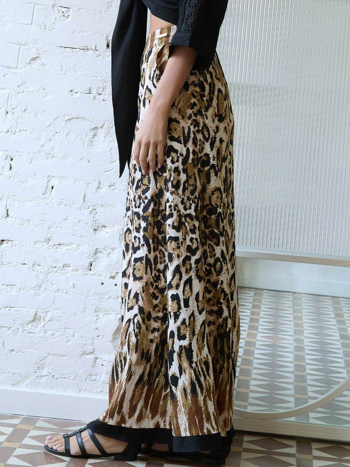 Pantalón ancho fluido, con estampado de animal print y bajos en negro, de tiro alto y camal ancho. Se abrocha en el lateral de la cintura con cremallera invisible.