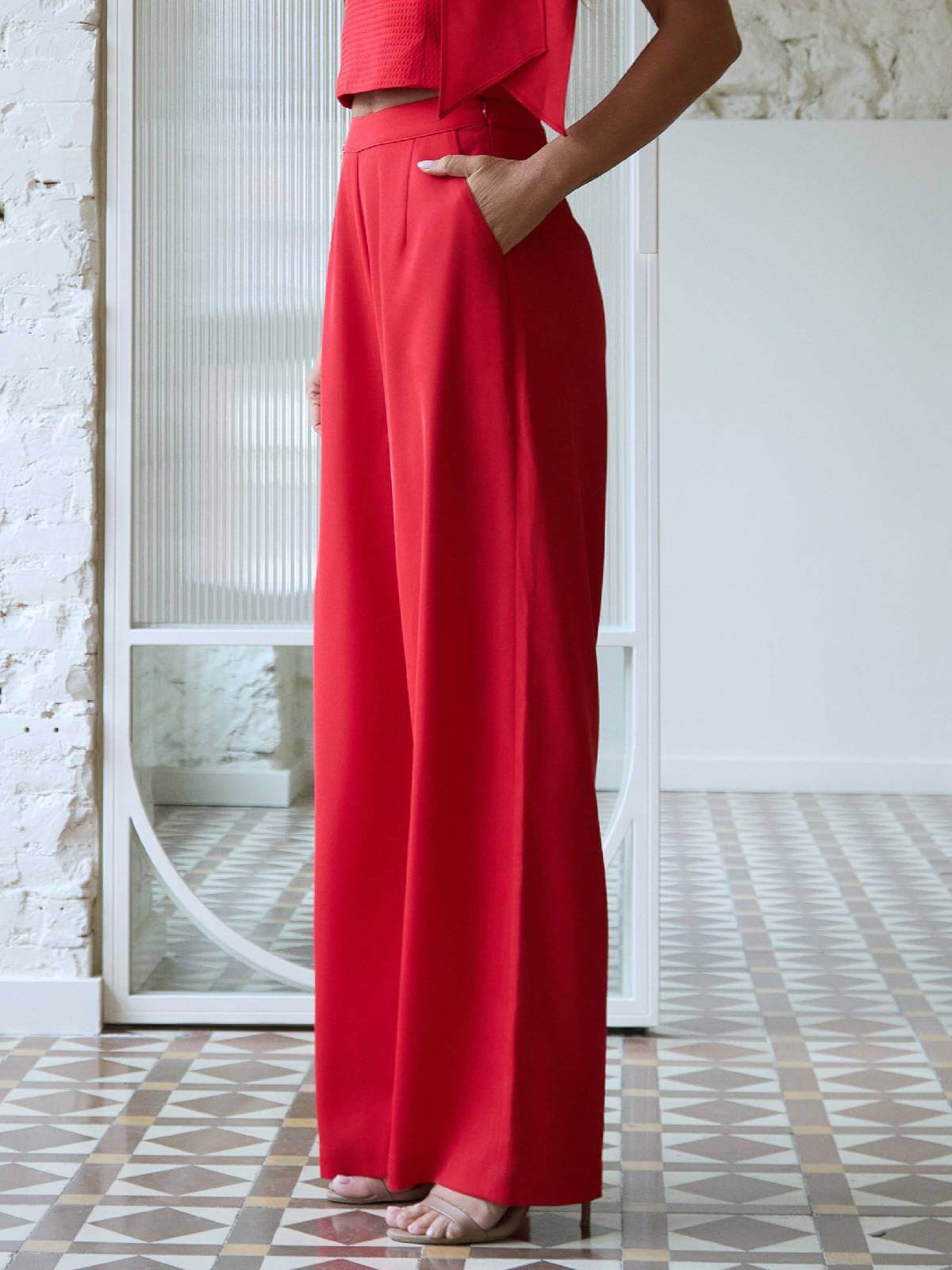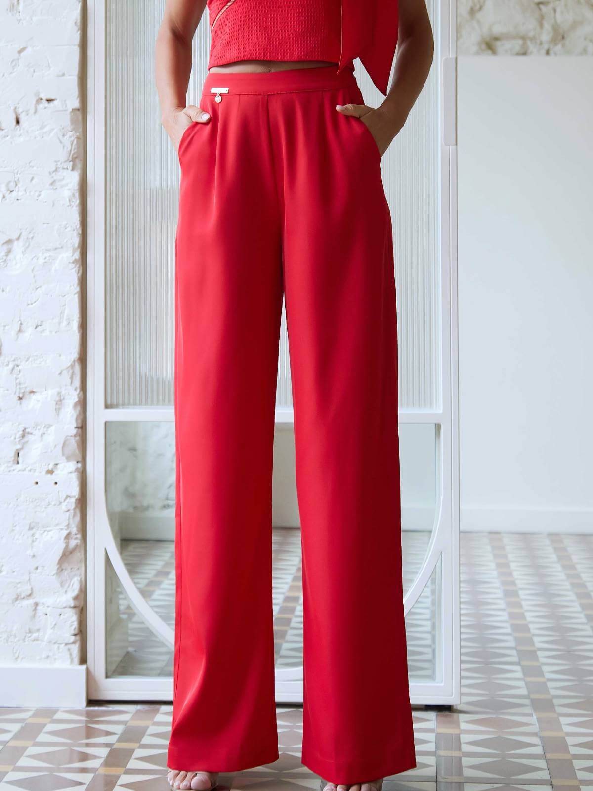 Pantalón largo rojo recto, de pinzas y tiro alto. Tiene dos bolsillos laterales y chapita de Camaleónica dorada en la cinturilla. Se abrocha en el lateral de la cintura con cremallera invisible.