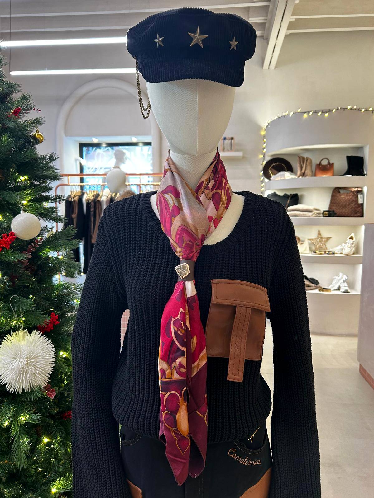 Pañuelo satinado en diferentes estampados. Incluye enganche para abrochar. Composición: 100% viscosa.