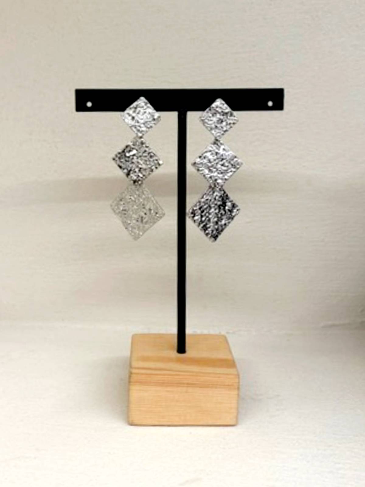 Pendientes con triple cuadrado rugoso de acero en color plata.