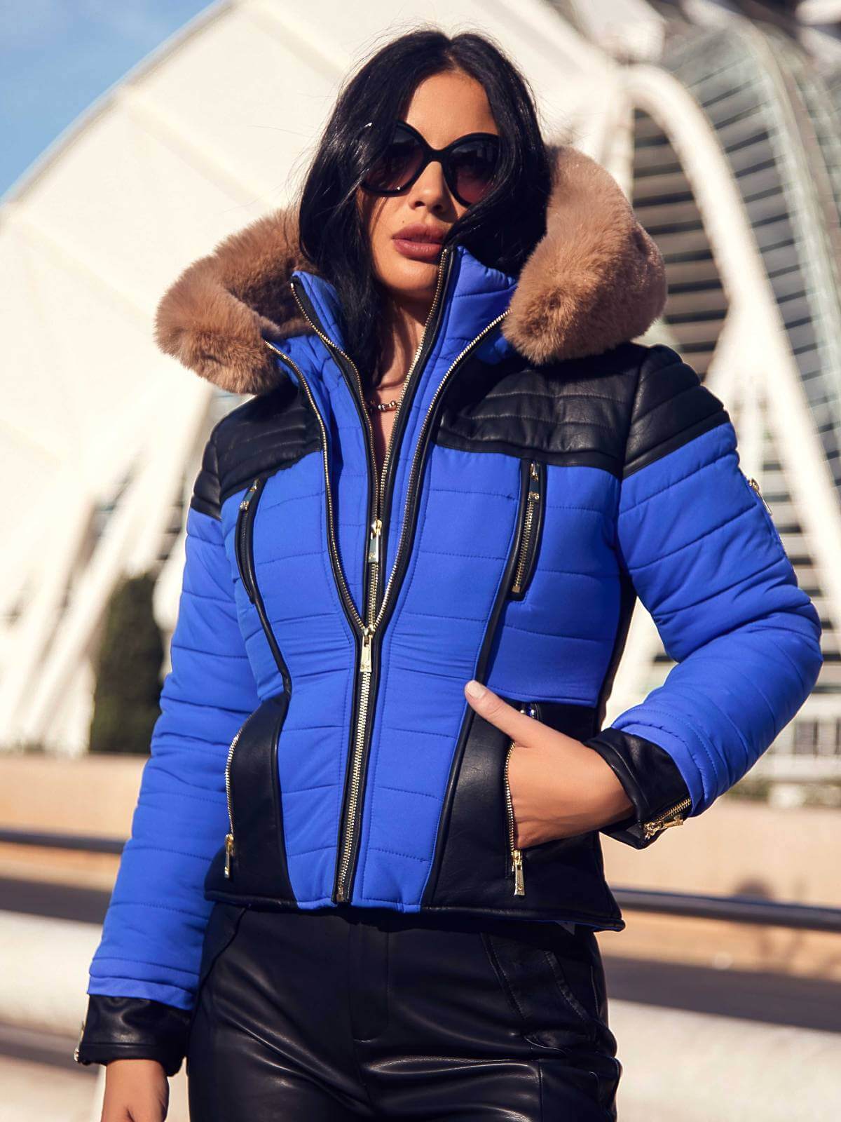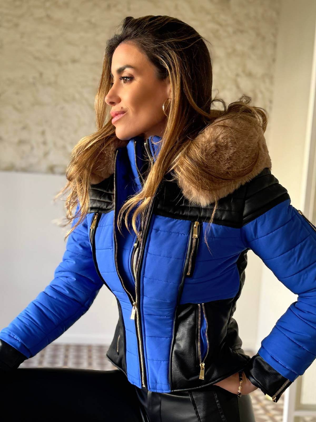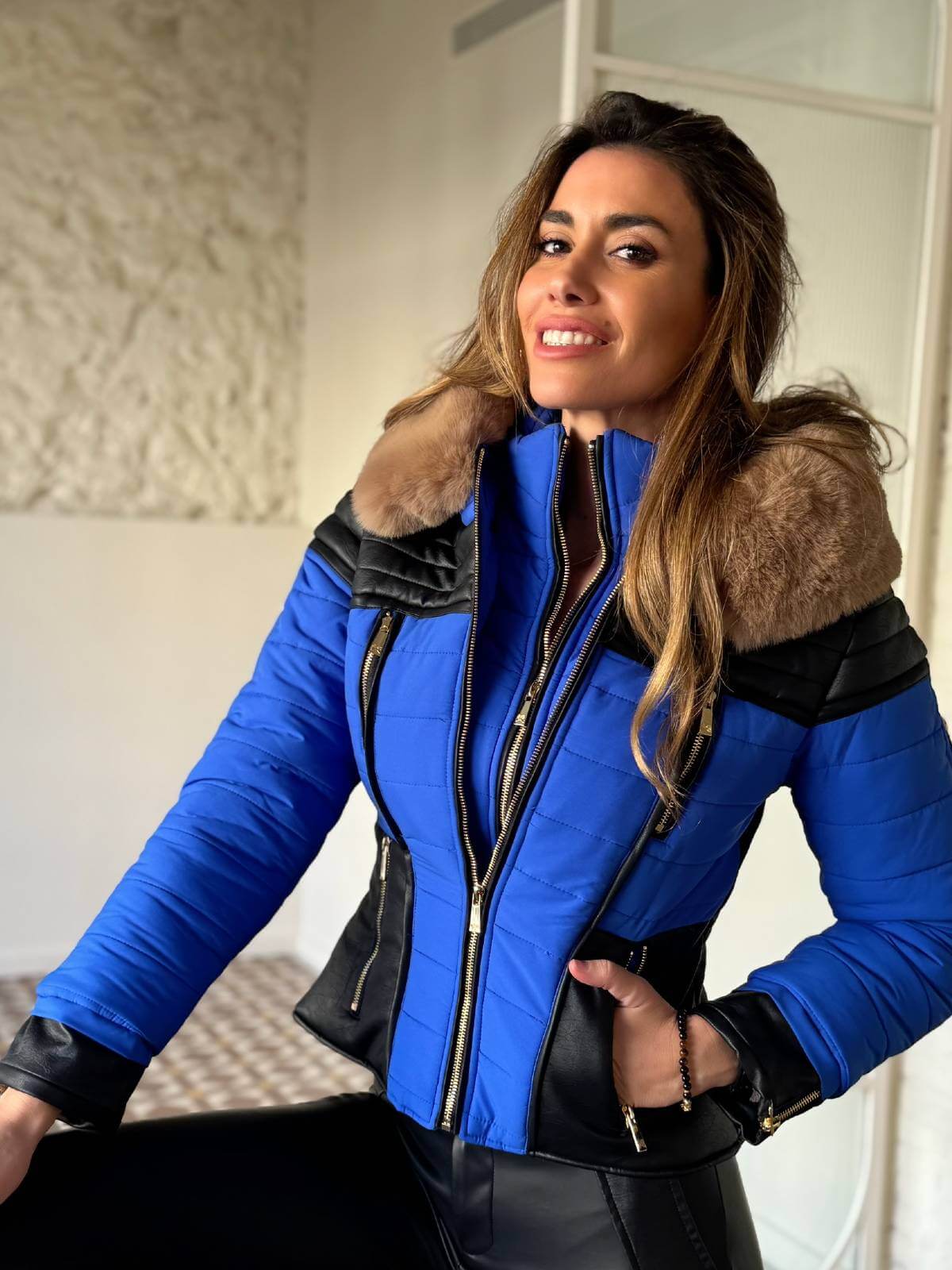 Abrigo plumas azul eléctrico con detalles de ecopiel negra. Capucha con pelo extraíble. Doble cremallera en la parte central. Dos bolsillos delanteros con cremallera dorada.