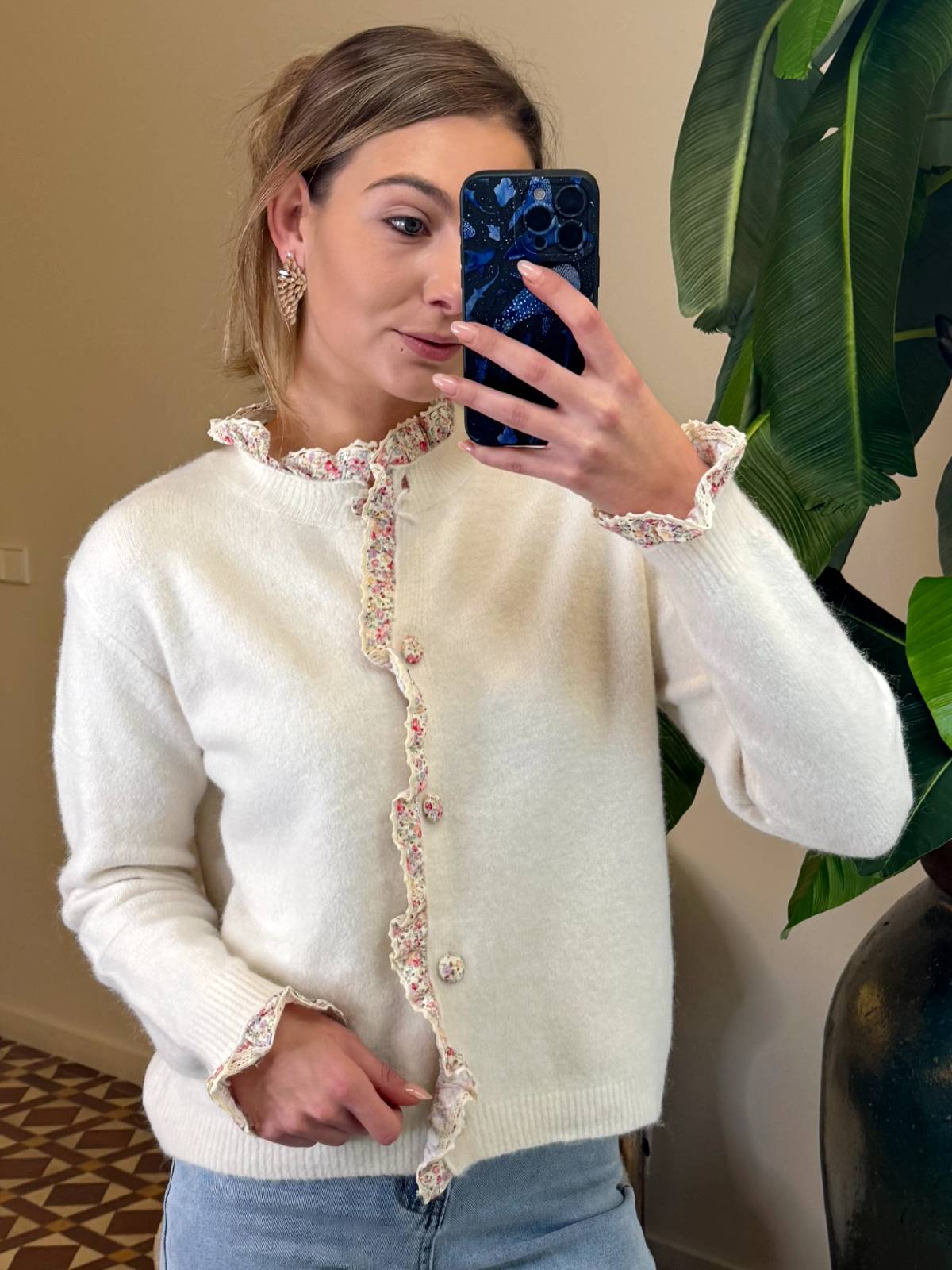 Rebeca de punto blanca de manga larga con cuello mao y abotonada en la parte delantera con detalle de puntilla en estampado floral igual que los botones. Composición: 50% poliamida, 35% viscosa, 10% lana, 5% elastán.