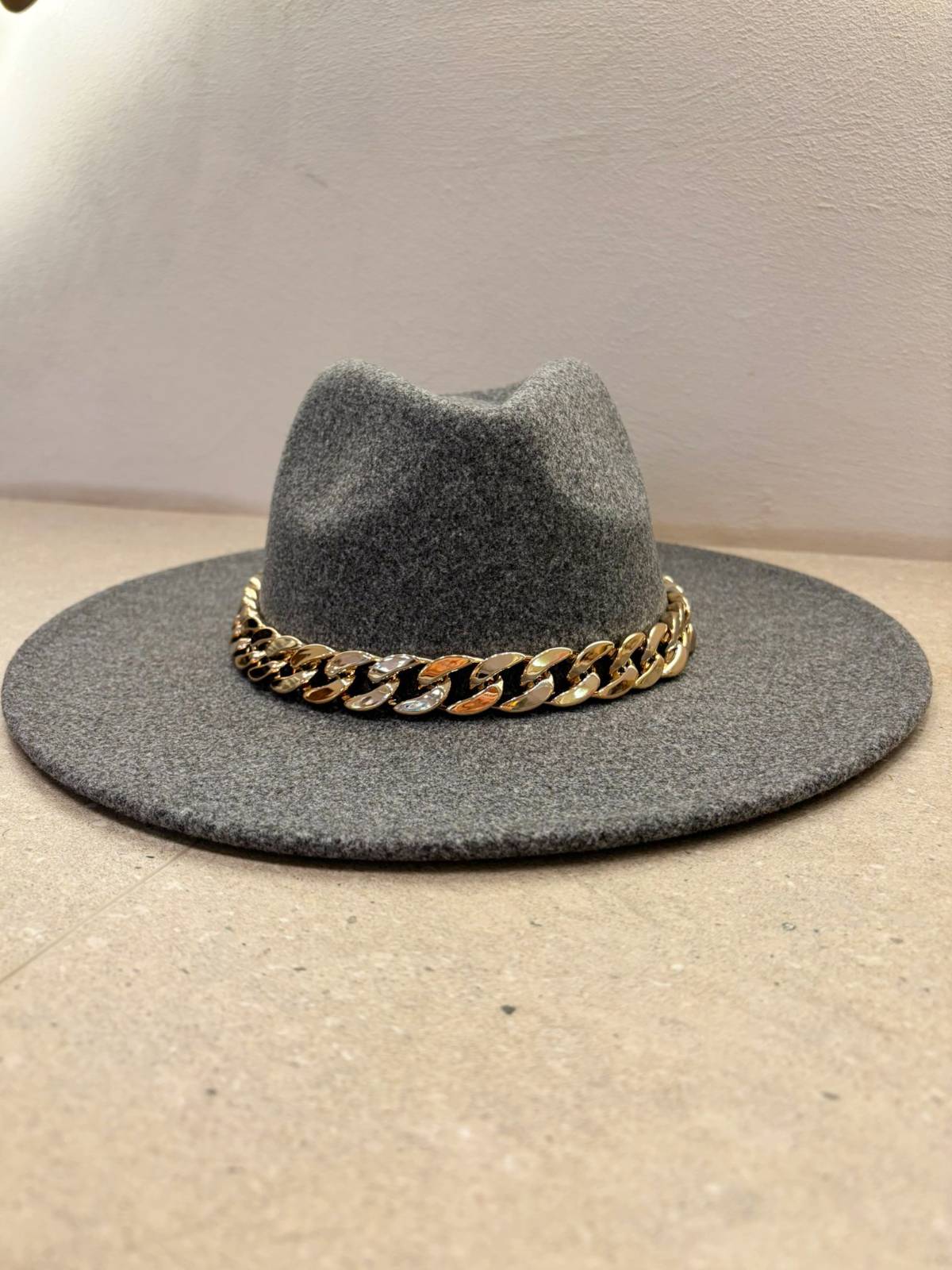Sombrero de fieltro con detalle de cadena anda en dorado. Composición: 100% poliester.