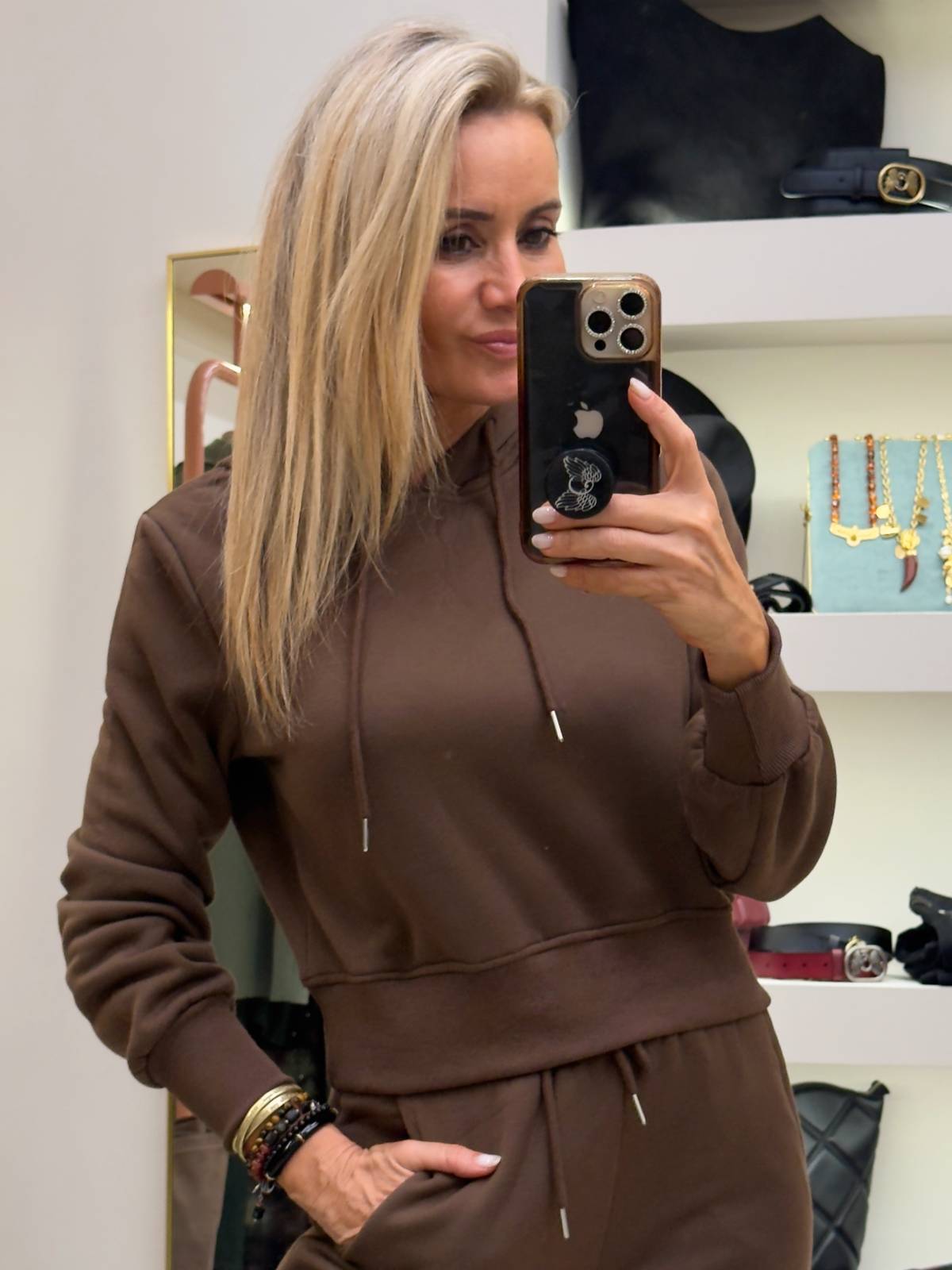 Sudadera marrón de manga larga corta con capucha. Composición: 65% algodón, 10% lana, 25% elastán.