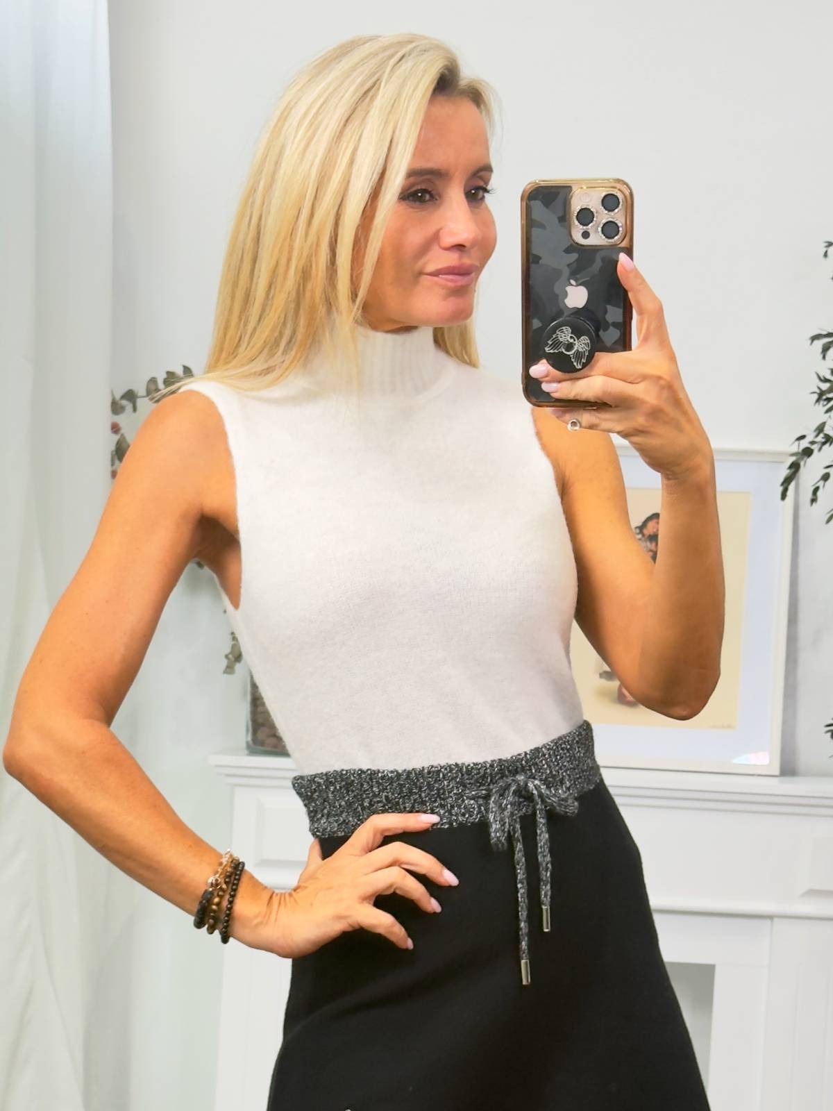 Top suave blanco de mezcla de lana y alpaca, con cuello alto y detalle de logotipo en el bajo. Composición: 30% Acrílico, 30% Lana, 22% Poliamida, 15% Alpaca, 3% Elastano