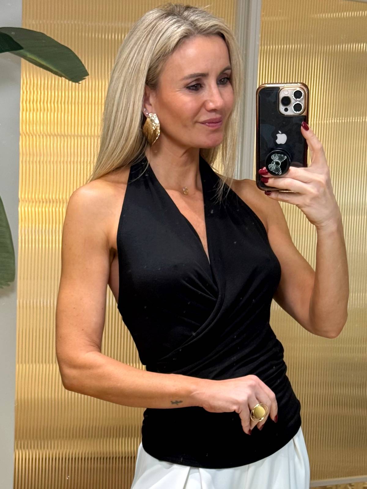 Top de algodón en color negro con cuello halter cruzado en frontal y espalda descubierta. Composición: 90% Algodón, 10% Elastano
