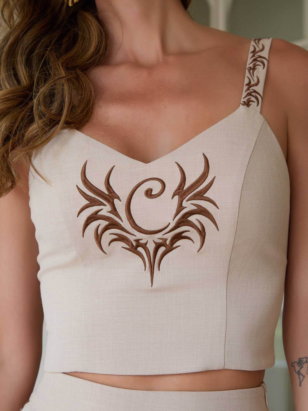 Top crop efecto lino en color beige con tirante fino regulable y escote en pico. Tiene bordado central en la zona del pecho en color marrón chocolate, al igual que en los tirantes. Se abrocha en la espalda con cremallera en dorado viejo.