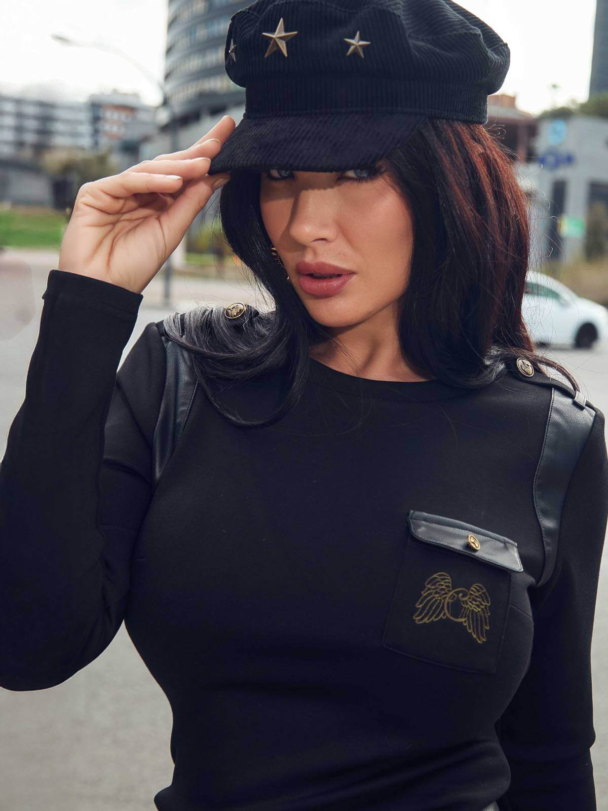 Camiseta de manga larga color negro con detalles en piel sintética. Pequeño bolsillo en el pecho con solapa de ecopiel y botón dorado, con logo de la marca. Trabillas en hombros. Detalle dorado en manga.