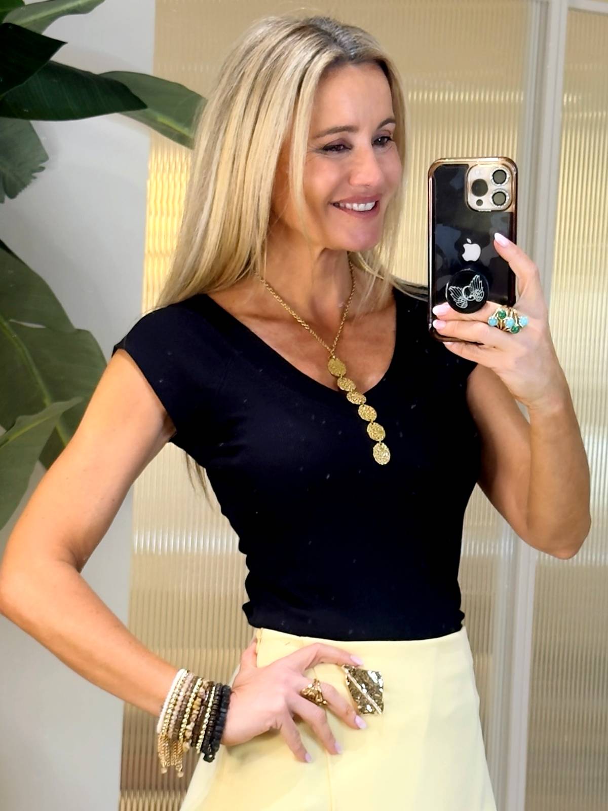 Top de punto acanalado de manga corta con escote en pico en frontal y espalda. Composción: 96% Algodón, 4% Elastano. La modelo lleva una talla S.
