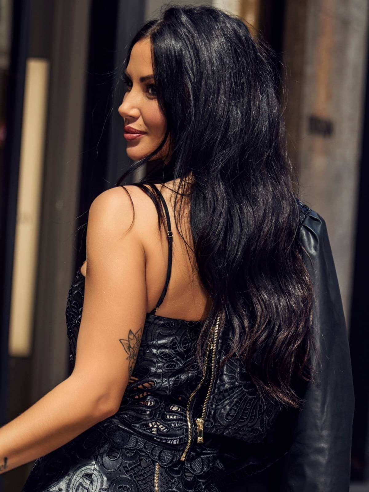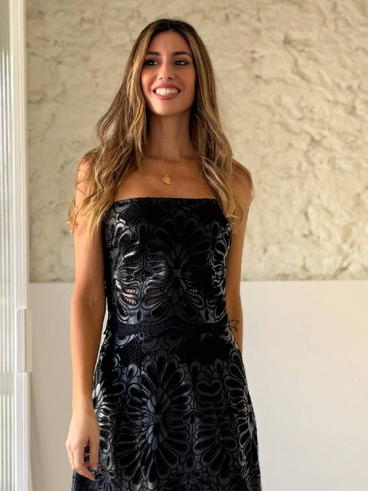 Top de ecopiel negro con detalle de encaje semitransparente. Tirantes regulables con detalle de ala dorada. Escote recto. Cremallera en la parte de la espalda.