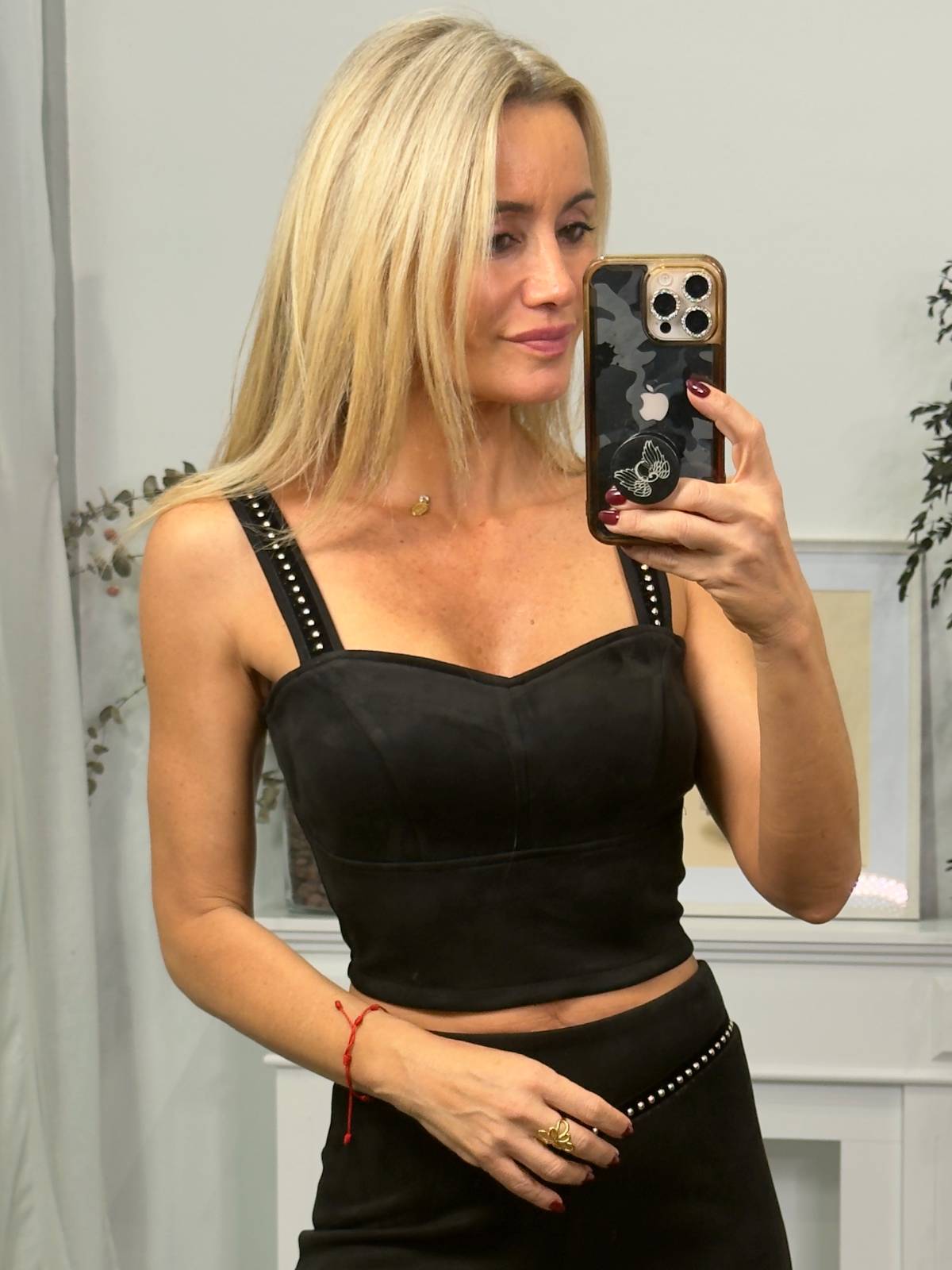 Top crop de antelina en color negro, con escote corazón y tirantes anchos. Detalle tachuelas metalizadas en tirantes. Cremallera invisible en espalda. Composción: 95% Poliéster, 5% Elastano