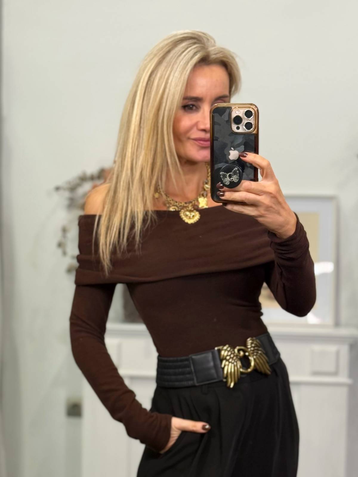 Top de algodón con escote en barco doblado, ajustado, con manga larga. Composición: 90% Algodón, 10% Elastano