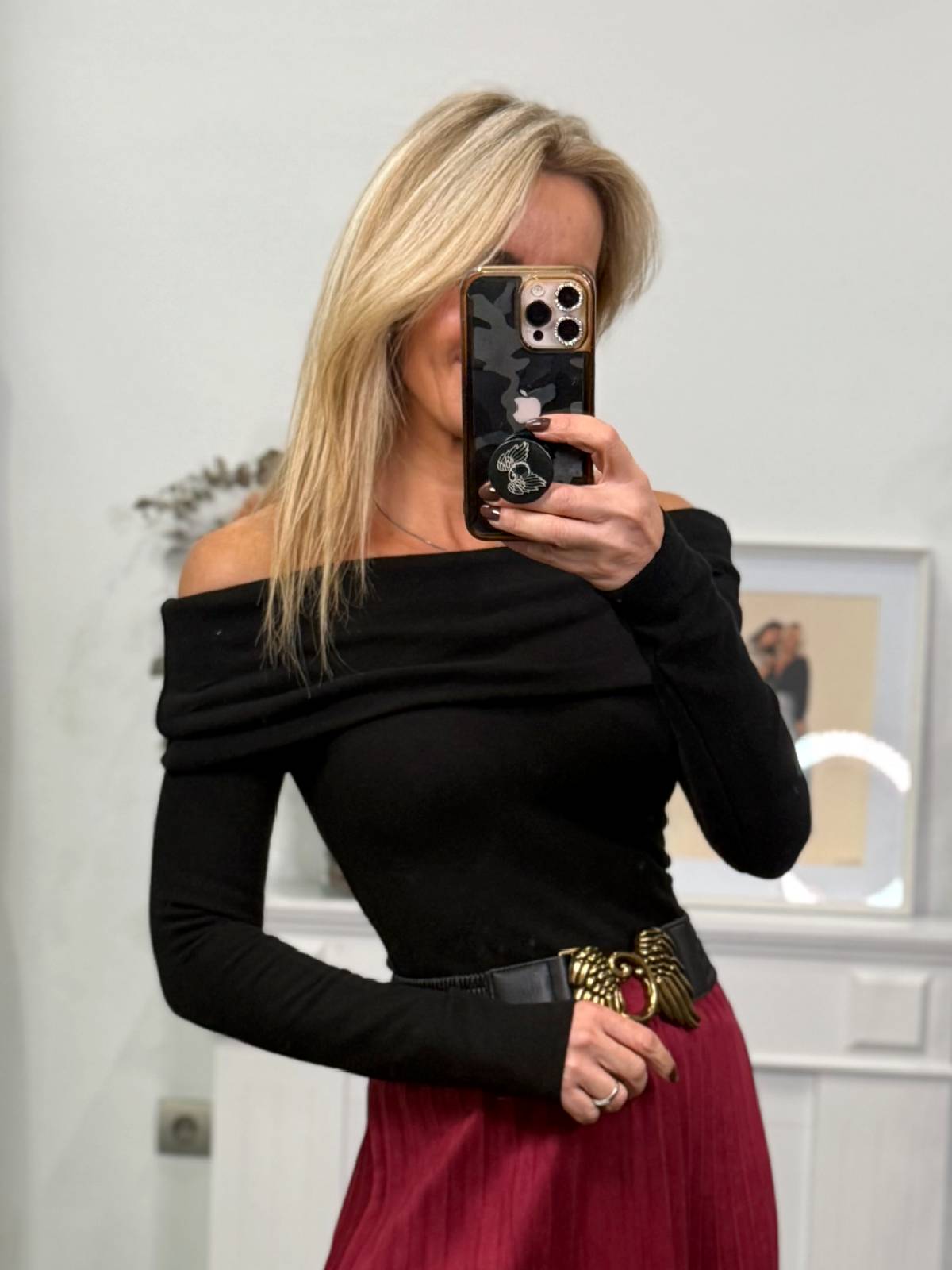 Top de algodón con escote en barco doblado, ajustado, con manga larga. Composición: 90% Algodón, 10% Elastano