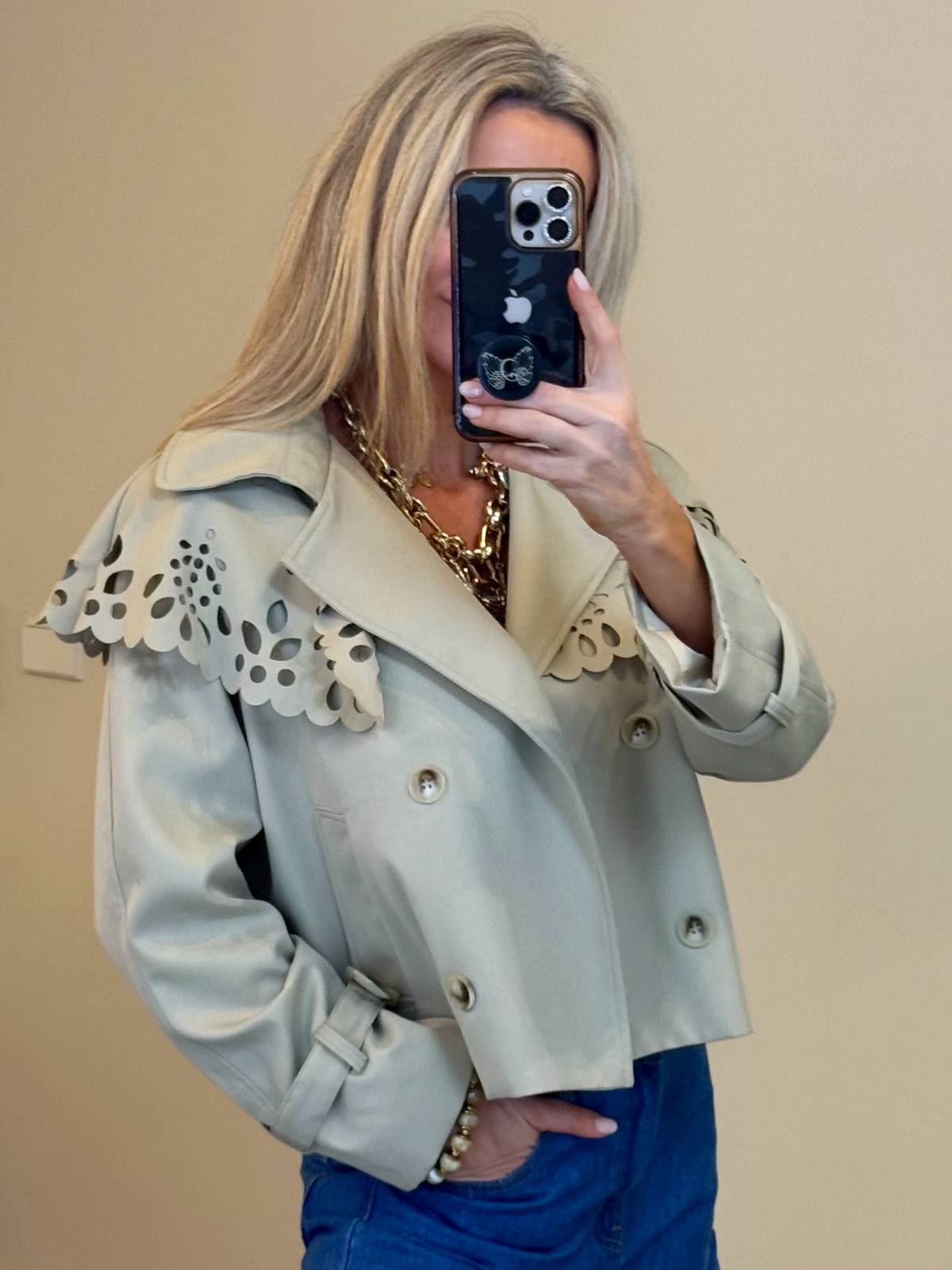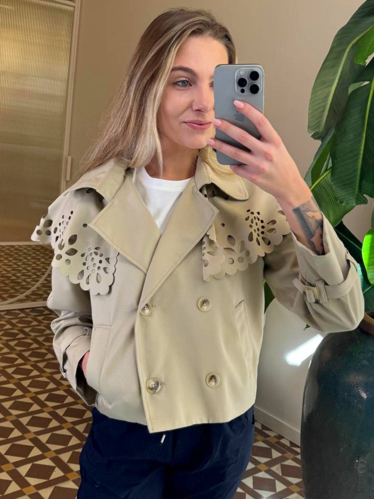 Trench corta beige abotonada en la parte delantera y escote en pico. Sobresolapa troquelada. Bolsillos laterales. Composición: 65% poliéster, 35% algodón.