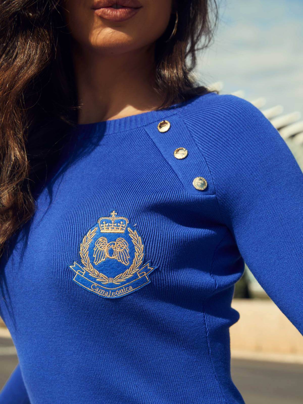 Vestido corto azul eléctrico de canalé ajustado de manga larga. Cuello redondo. Detalles de falsos botones dorados en el pecho. Bordado del logo de la marca en la parte del pecho. Falsos bolsillos con detalles dorados en frontal.