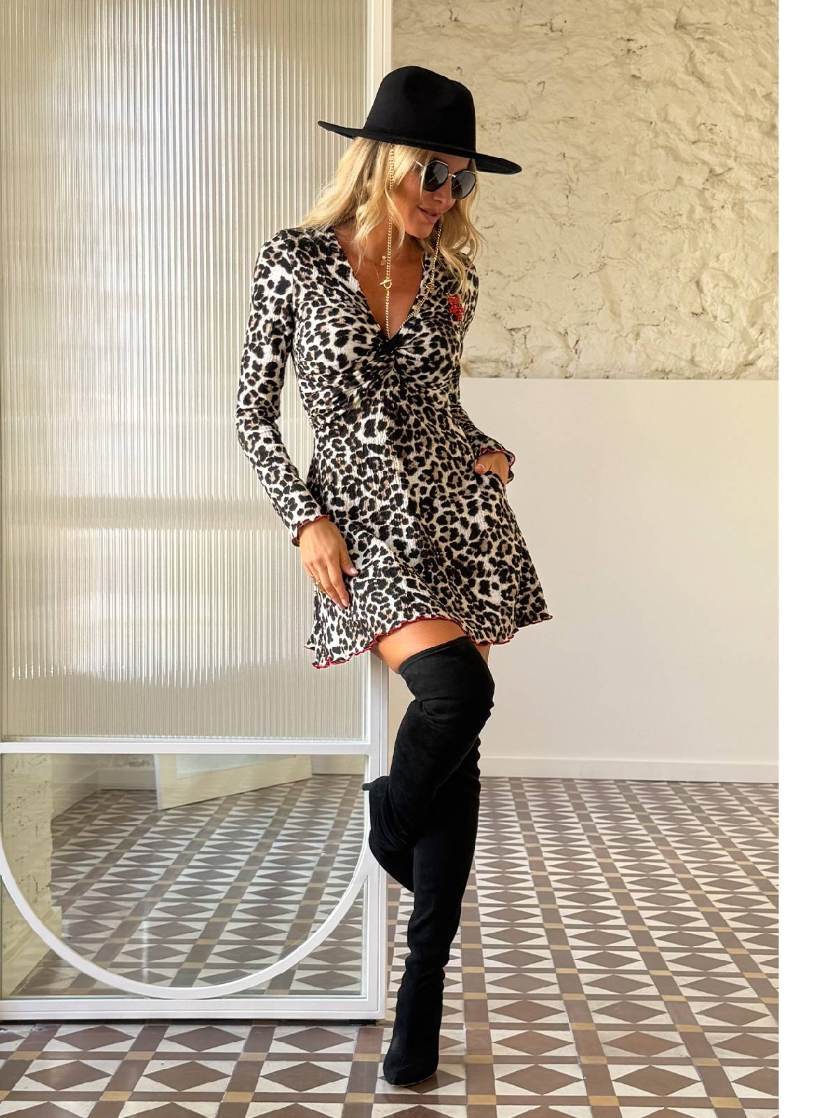 Vestido corto estampado animal print con escote en pico y hombreras. Nudo central en el pecho. Cremallera invisible lateral. Ribete rizado rojo en mangas y bajo.
