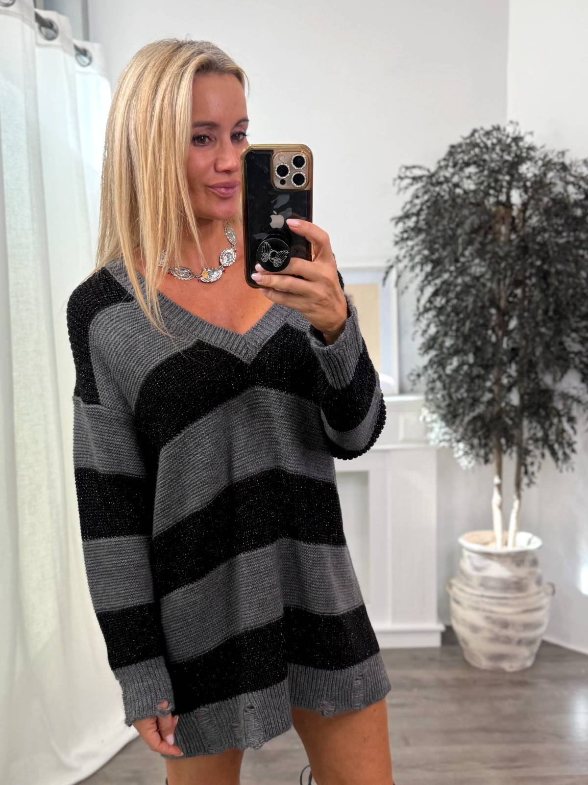 Vestido corto de punto de manga larga, escote en pico y estampado de rayas negro y gris con detalle de lurex. Composición: 47% viscosa, 36% acrílico.10% poliéster, 5% lana, 2% alpaca.
