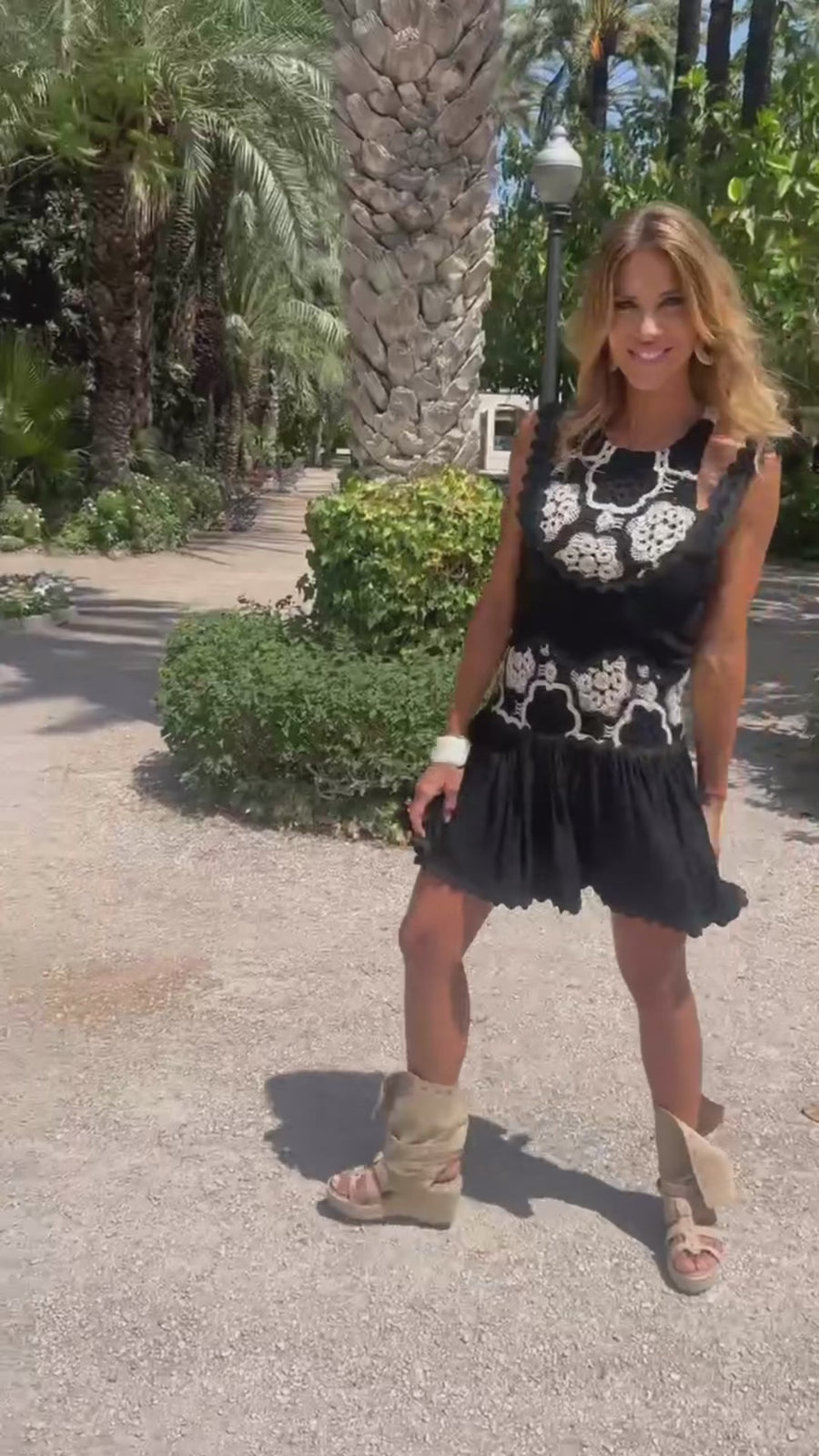 Vestido corto negro fluido, de tirante ancho, con escote redondo pronunciado en pecho y espalda. La cintura tiene una franja de crochet en beige y negro ribeteada con pasamanería ondulada en negro, al igual que en los tirantes, escote y bajo. De la cintura sale un volante. Se abrocha con cremallera invisible en un lateral. El vestido lleva un top crop de crochet en beige y negro con cuello halter y espalda nadadora con cremallera en negro.