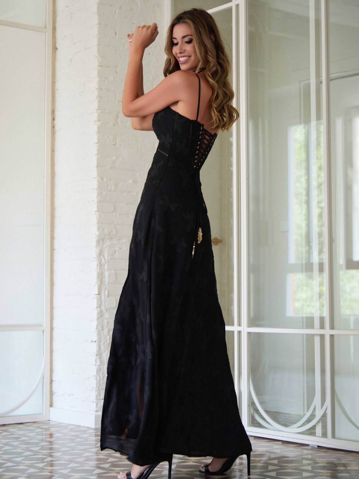 Vestido largo negro con siluetas de mariposas bordadas en negro, escote recto con cazuela y tirante fino negro regulable. Desde bajo del pecho hasta la cintura, lleva cuatro finas pasamanerías en negro para marcar la cintura. Tiene abertura en la pierna. La espalda es recta con abertura en pico que se cierra con lazadas en negro, cruzadas con arandelas en dorado, que terminan en los extremos con dos alas en dorado. Se abrocha con cremallera invisible lateral.