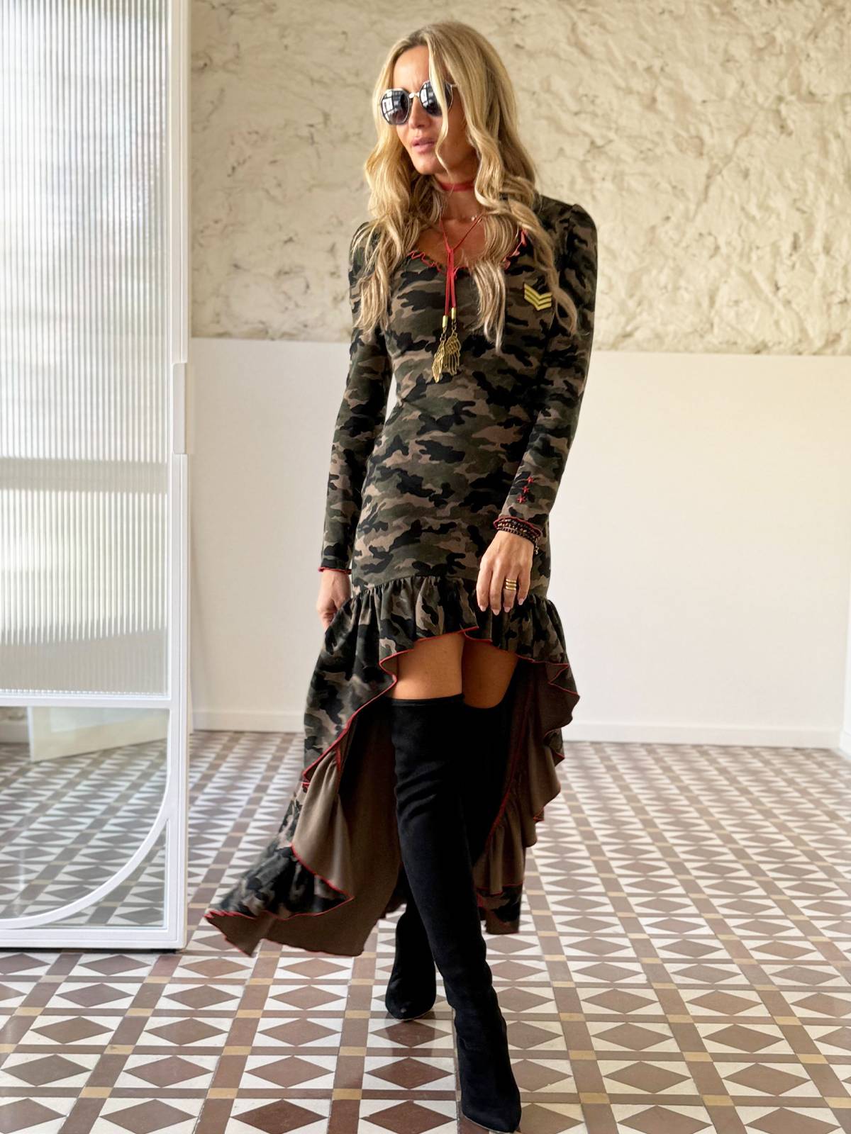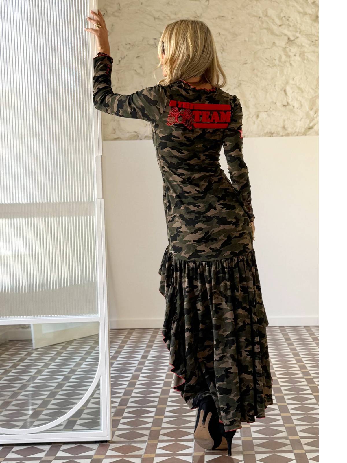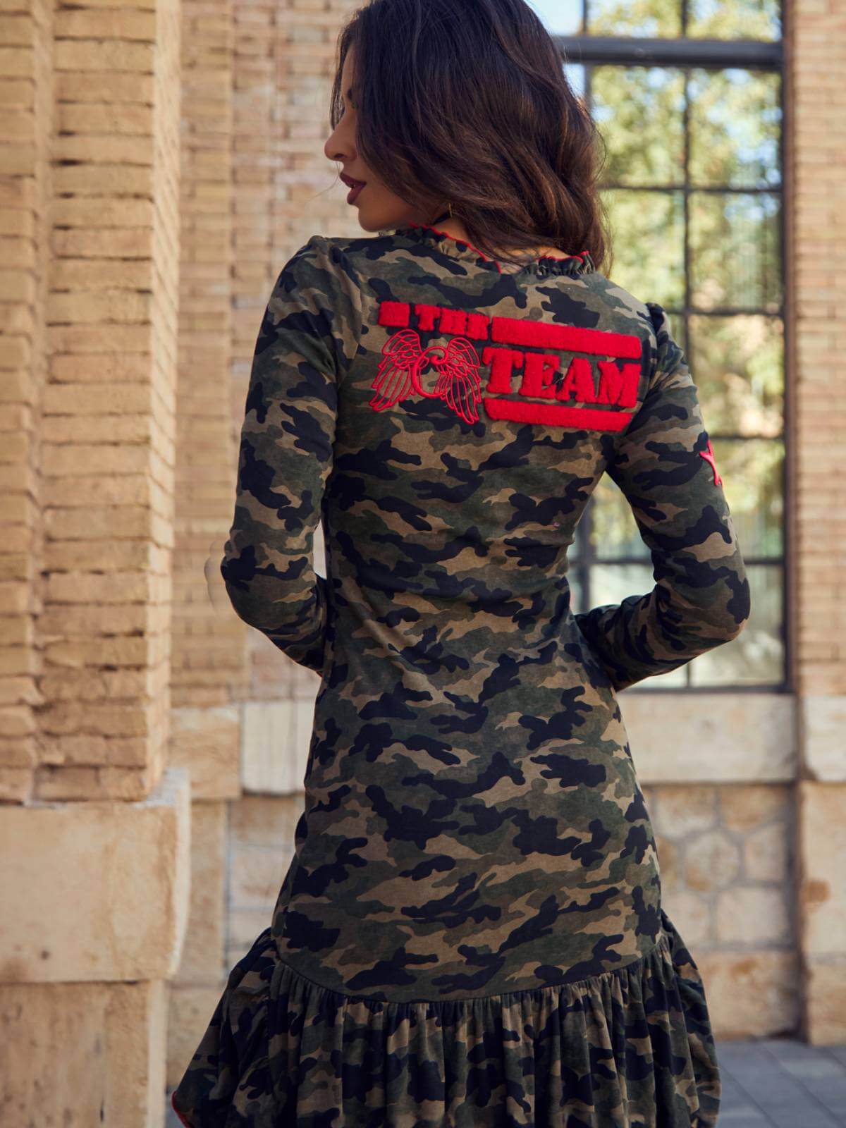 Vestido larga asimétrico, corto por delante y largo por la parte trasera. Estampado de camuflaje. Escote en pico y bajo con volante. Ribete rizado en rojo. Bordado en paño rojo en la parte de la espalda.