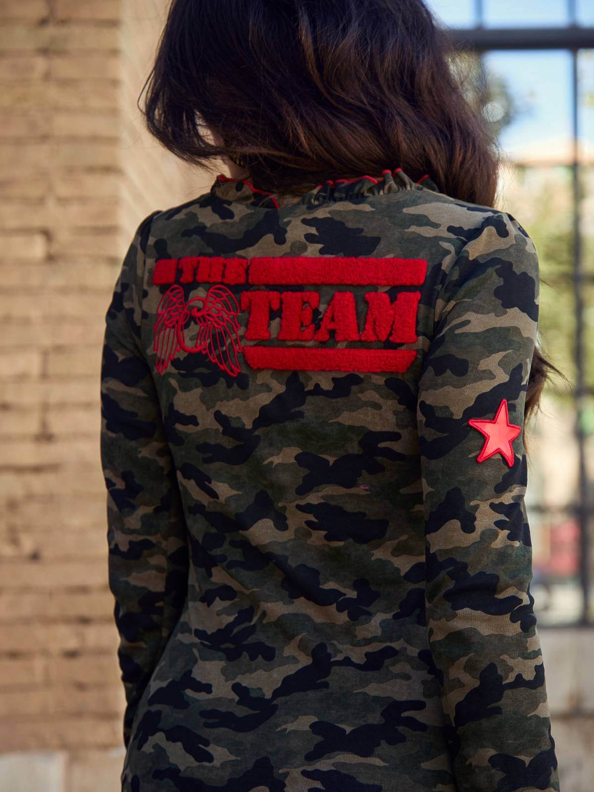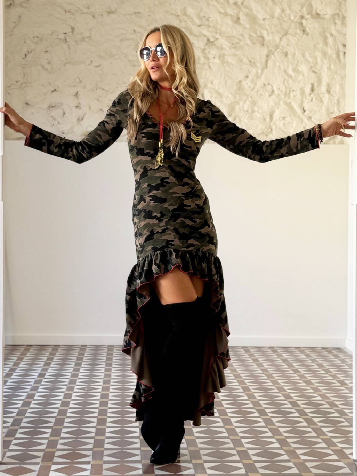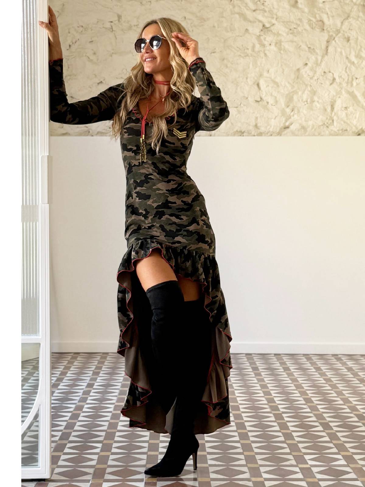 Vestido larga asimétrico, corto por delante y largo por la parte trasera. Estampado de camuflaje. Escote en pico y bajo con volante. Ribete rizado en rojo. Bordado en paño rojo en la parte de la espalda.