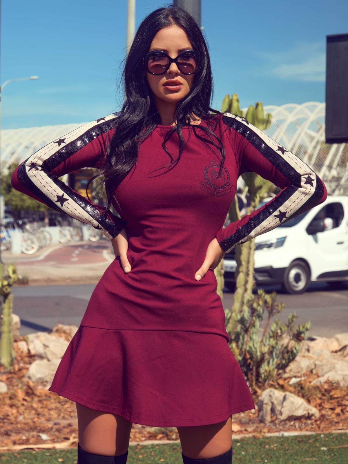 Vestido corto en color burdeos con falda de vuelo y cuello redondo. Detalle de estrellas y bandas con lentejuelas en mangas. Bordado logo de la Camaleónica en el pecho. Cierre con cremallera en espalda.