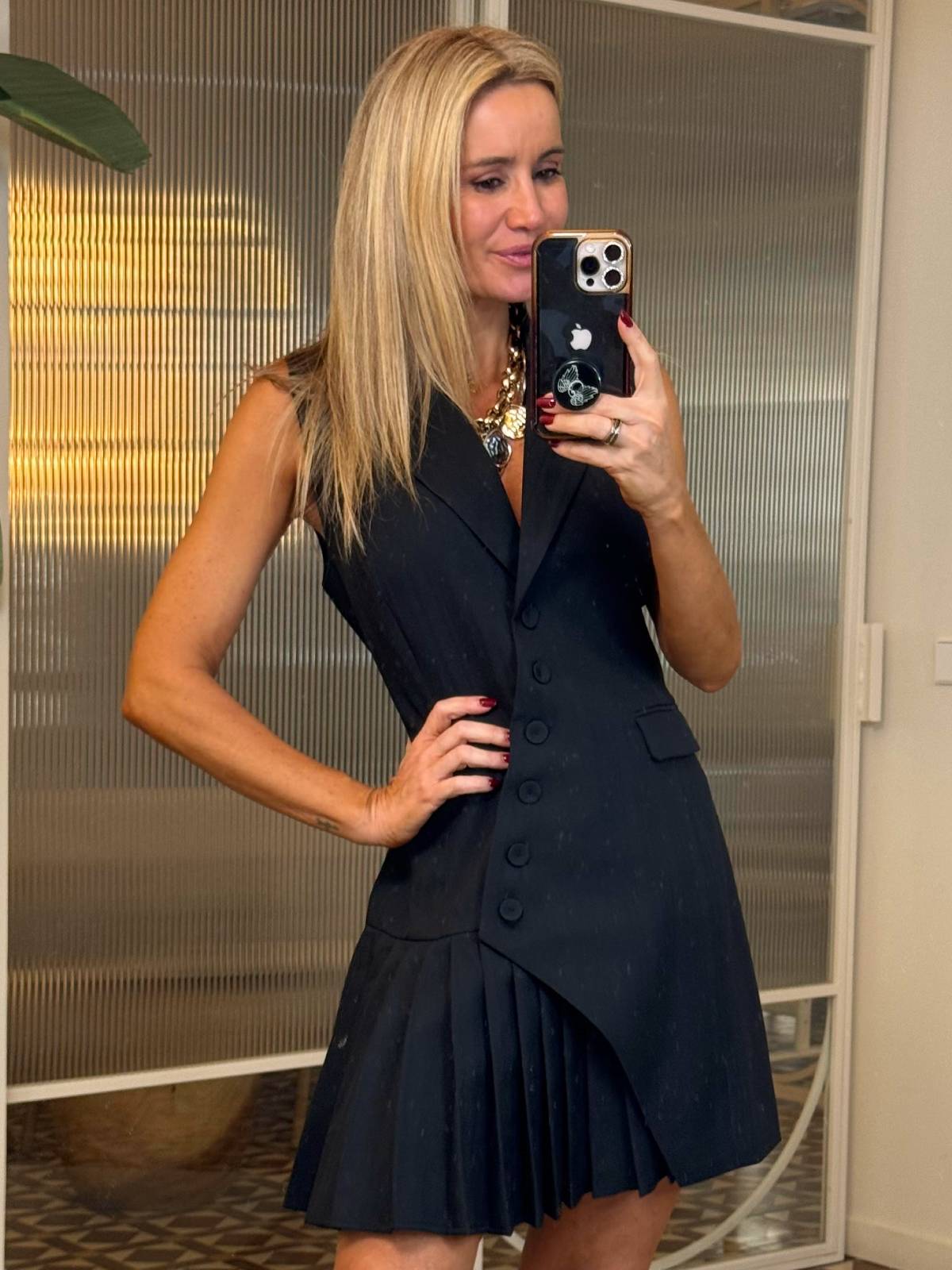 Vestido negro corto estilo blazer, desmangado, con falda de tablas. Cierre cruzado con botones en frontal y bolsillos con solapa. Composición: 97% Poliéster, 3% Elastano La modelo lleva una talla S.