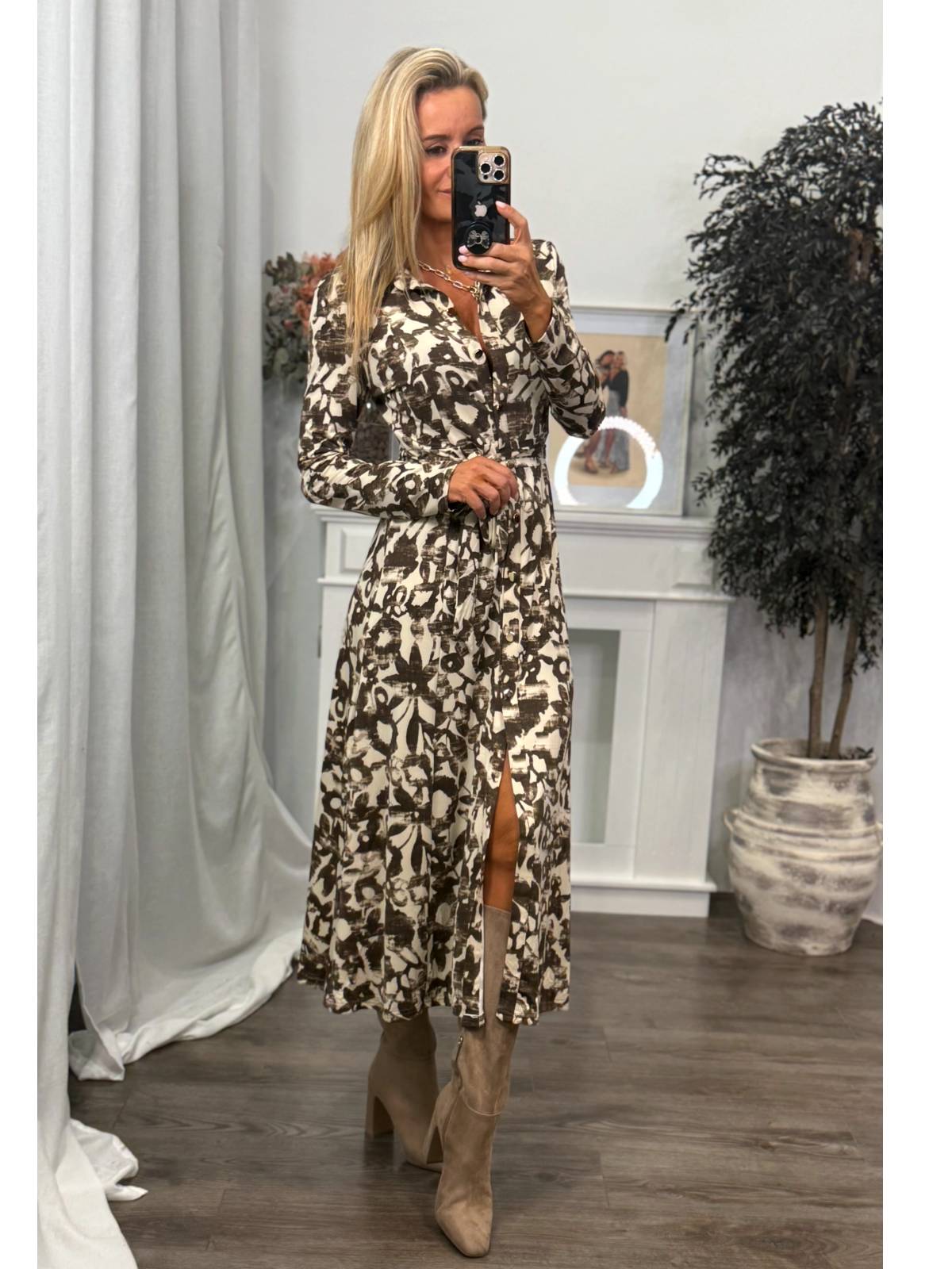 Vestido largo con estampado en color marrón y beige. Cierre con botonadura central. Manga larga.. Cinturón atado con lazada. Composición: 65% Poliéster, 30% Viscosa, 5% Elastano.