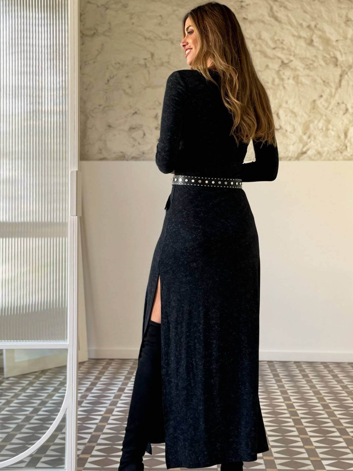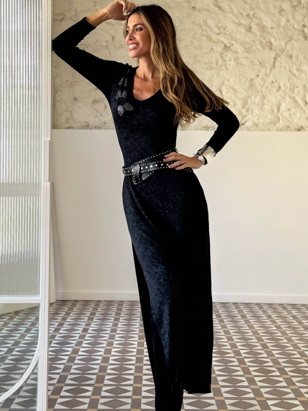 Vestido largo gris jaspeado, de manga larga y escote en pico. Detalle del logo con strass en la parte del pecho. Aberturas laterales en el bajo de la falda. Forro polar.