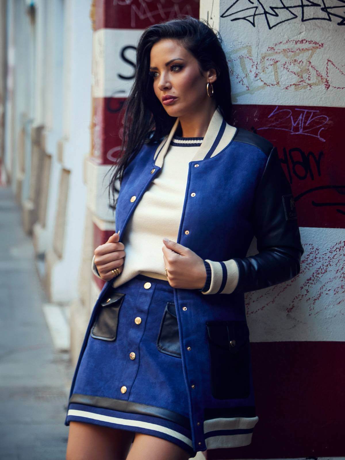Chaqueta azul klein de antelina, estilo universitaria, con borreguito sintético en interior. Mangas y hombros con detalles de ecopiel en negro. Cierre central con botones delanteros en dorado. Doble bolsillo frontal de ecopiel con solapa y botón dorado. Puños y bajo y cuello en goma con franjas beige. Parte trasera lisa.