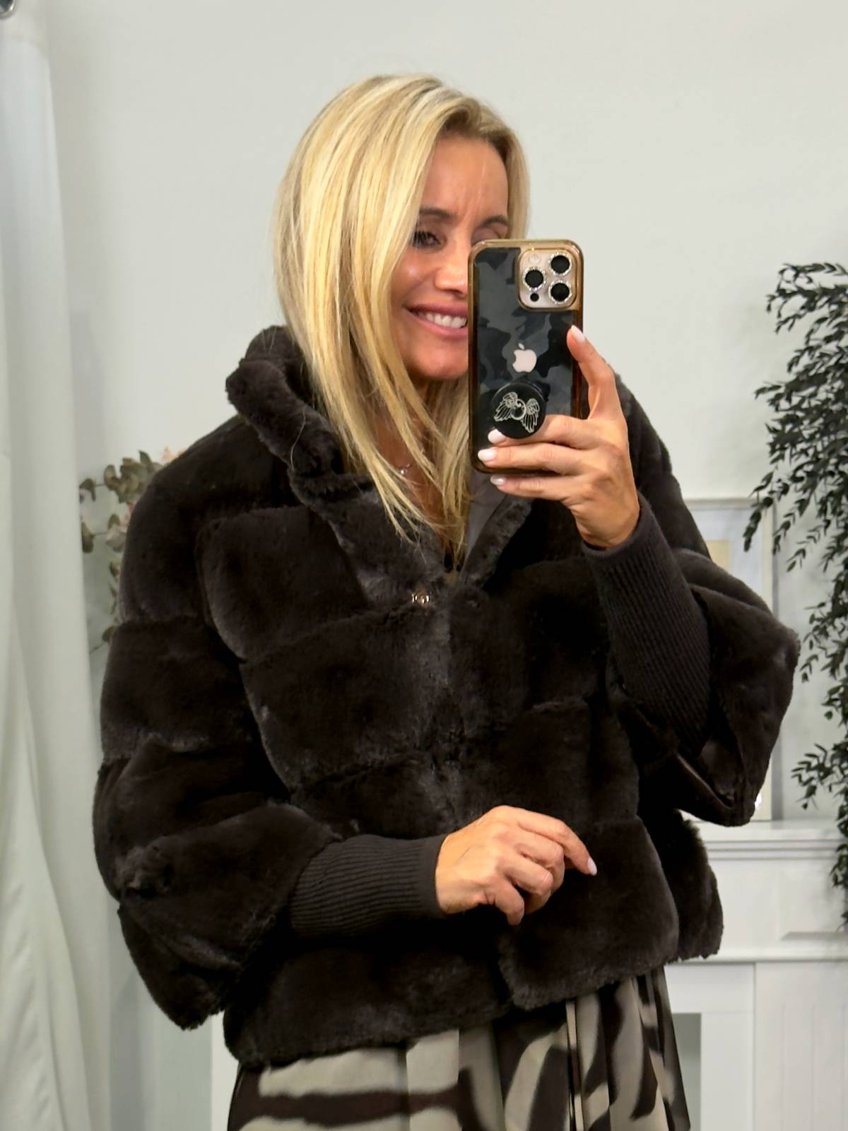 Abrigo corto de pelo sintético marrón, con puños de canalé extraíbles con cremallera. Manga ancha. Bolsillos en laterales. Cierre central con botones. Composición: 100% poliéster.