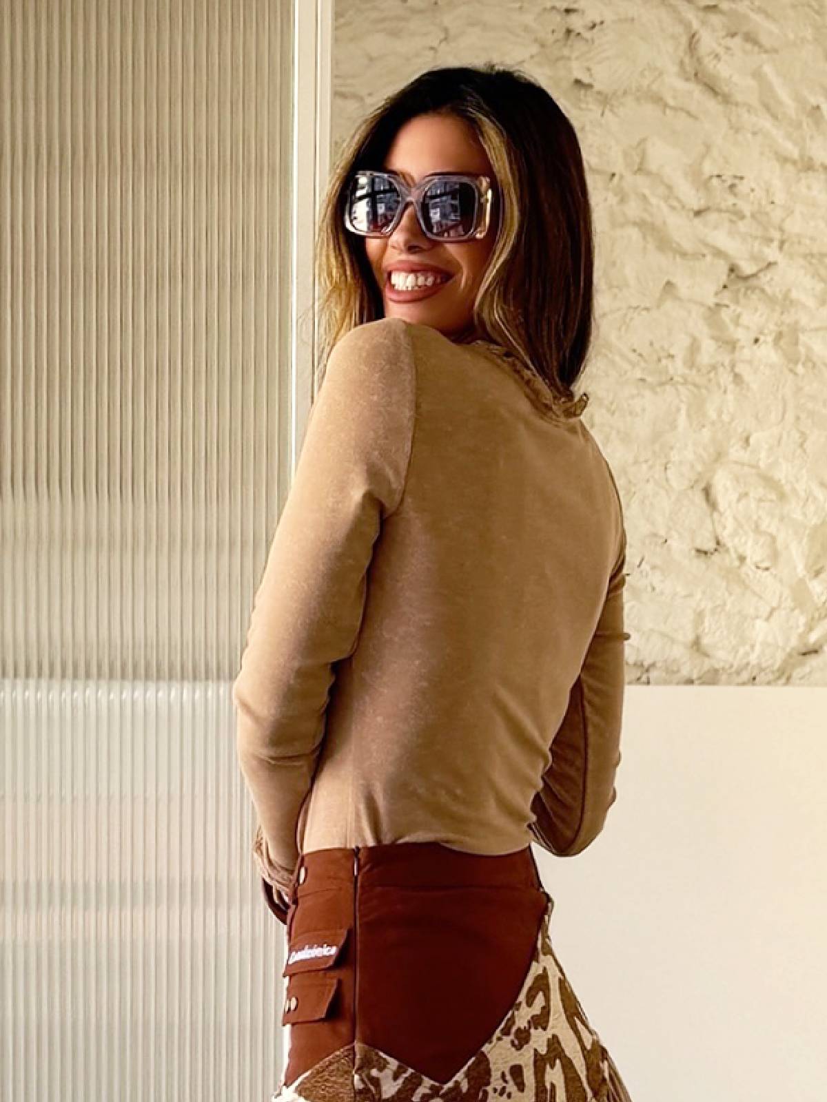 Camiseta color arena desgastada de manga larga, escote redondo con detalle de puntilla en puños y escote. Detalle de falso botón en el escote del mismo tejido. Forro polar.