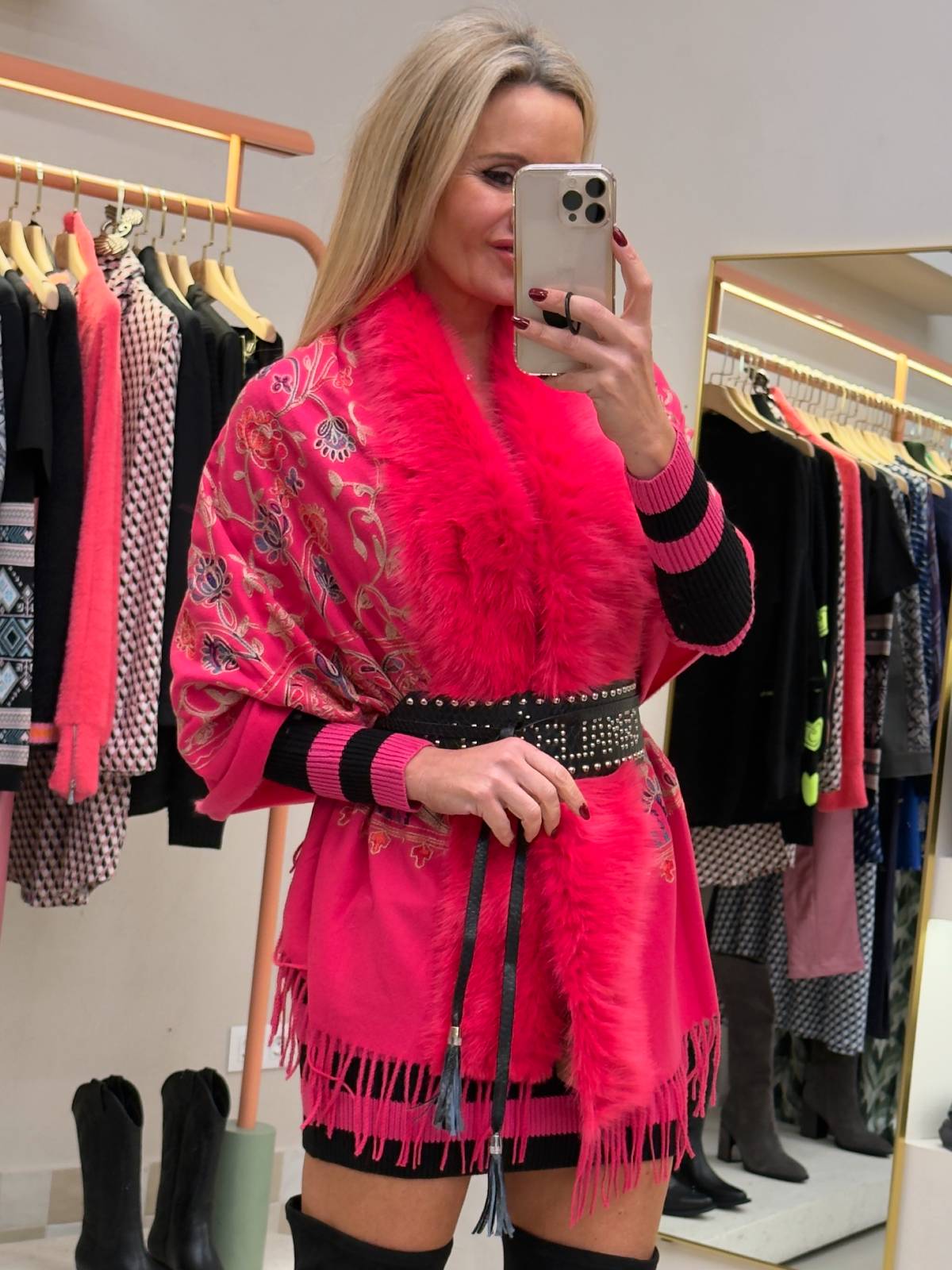 Capa com bordado nas costas, franjas e detalhe de pelo no decote. Composição: 100% poliéster.