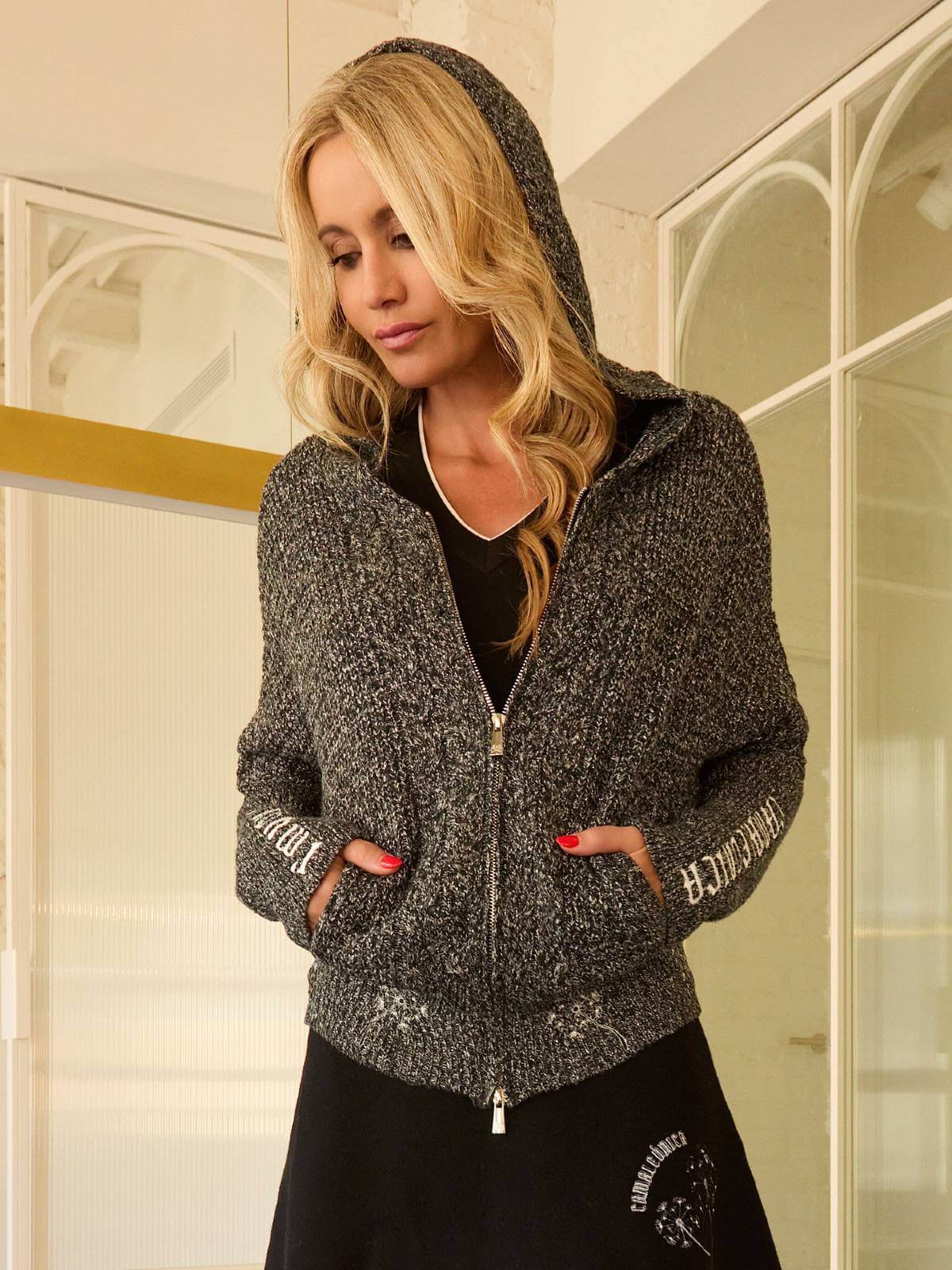 Cárdigan de punto gris jaspeado de manga larga con lúrex plata. Tiene capucha y cremallera en la parte delantera. Detalles bordados en blanco en ambas mangas y en el bajo.