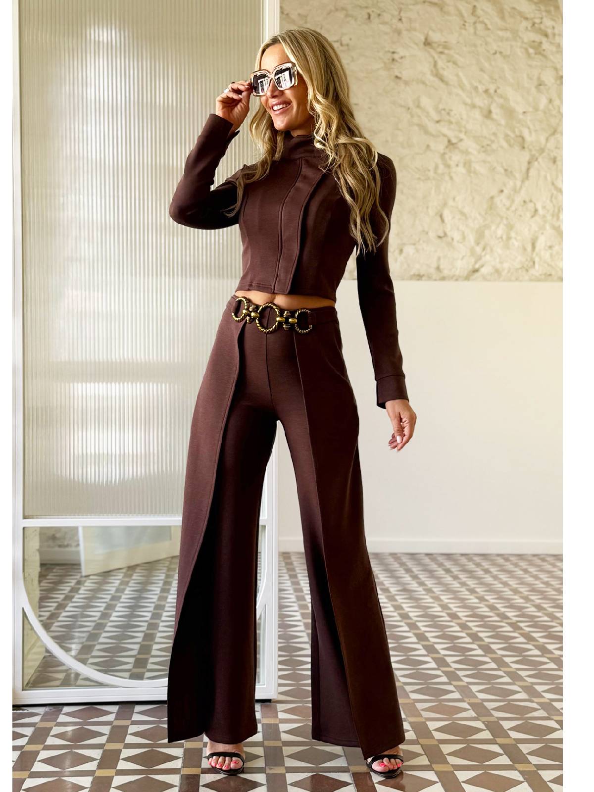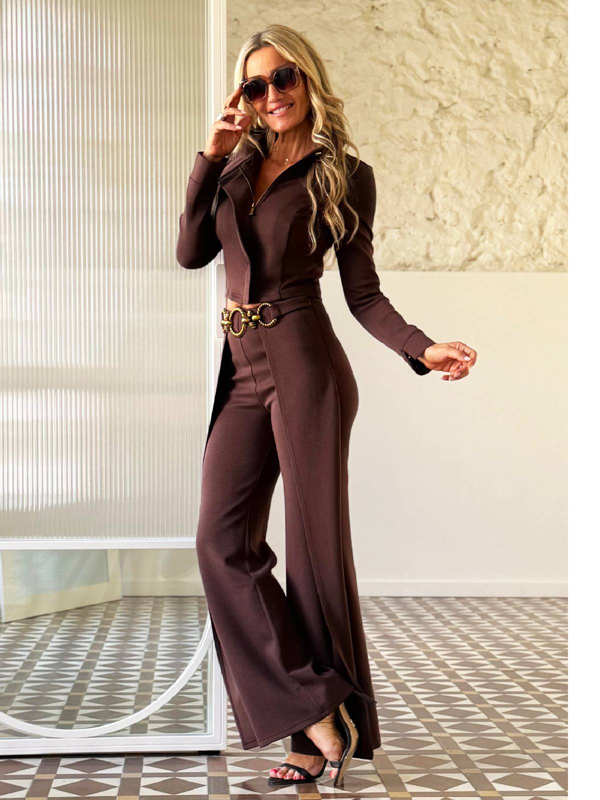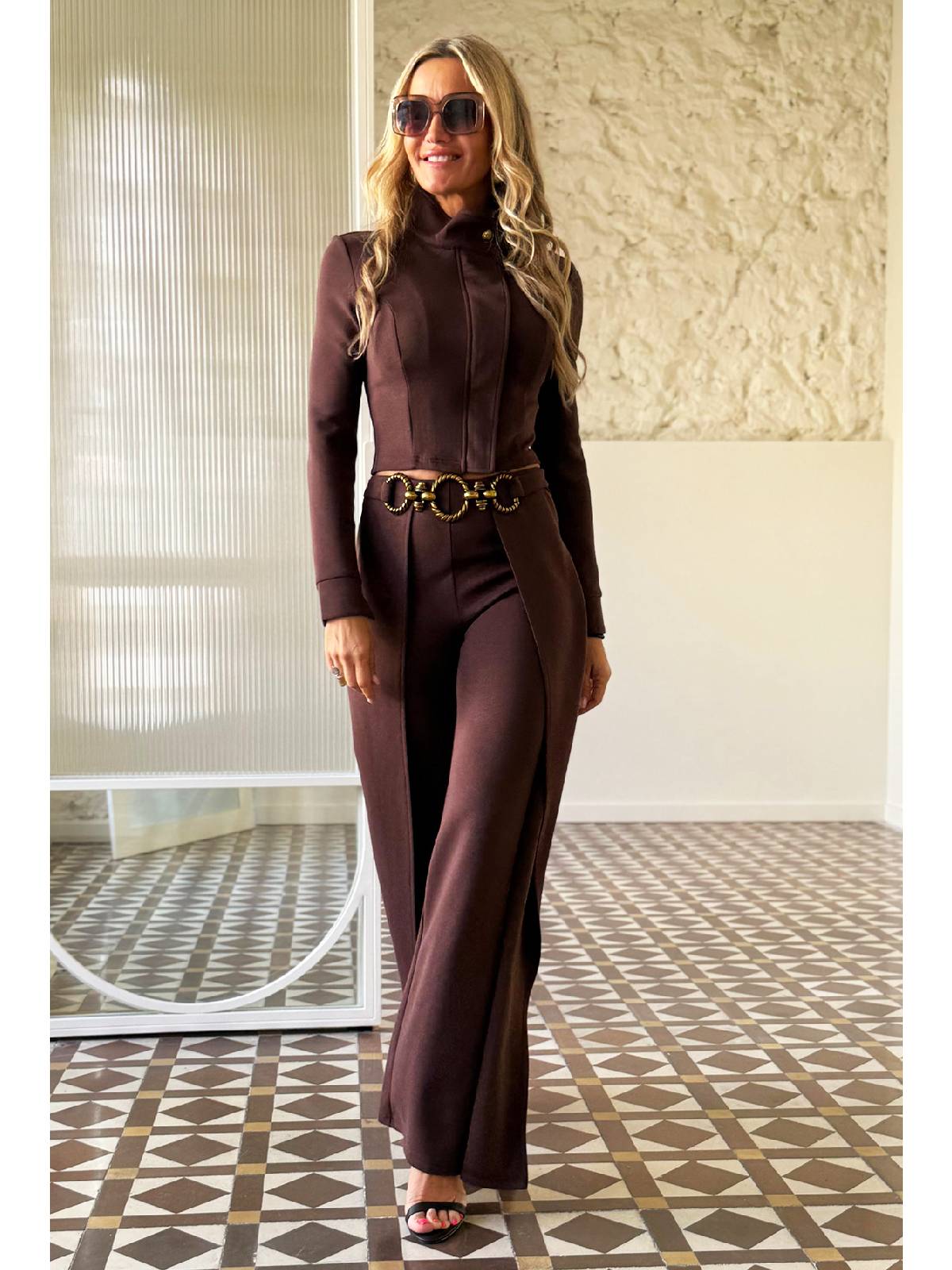 Conjunto de dos piezas de pantalón y chaqueta marrón. Chaqueta de cuello alto con botón dorado y manga larga. Se abrocha con cremallera. Pantalón palazzo con detalle de cinturón cobre en la cintura y capa en cada camal. Cremallera invisible lateral.