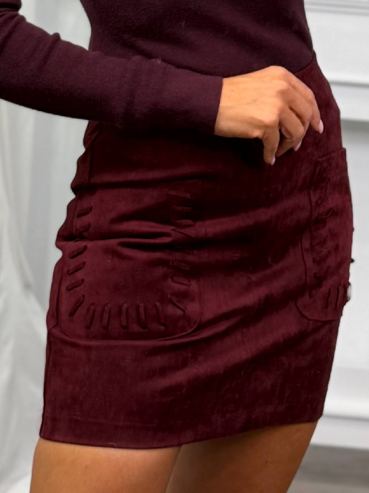 Falda mini de antelina en color burdeos. Doble bolsillo frontal con detalle cordón. Cremallera invisible en espalda. Composición: 100% Poliéster.