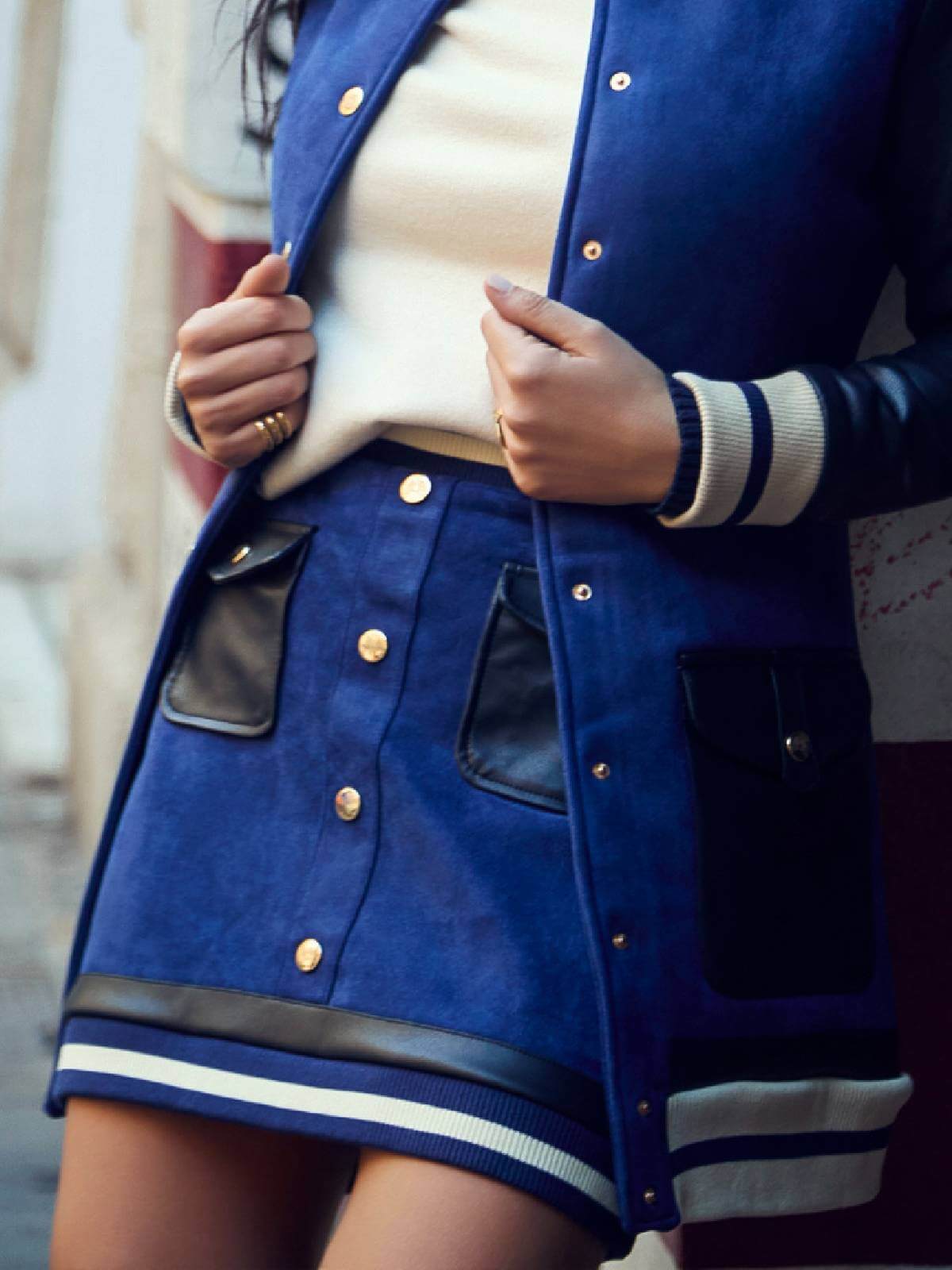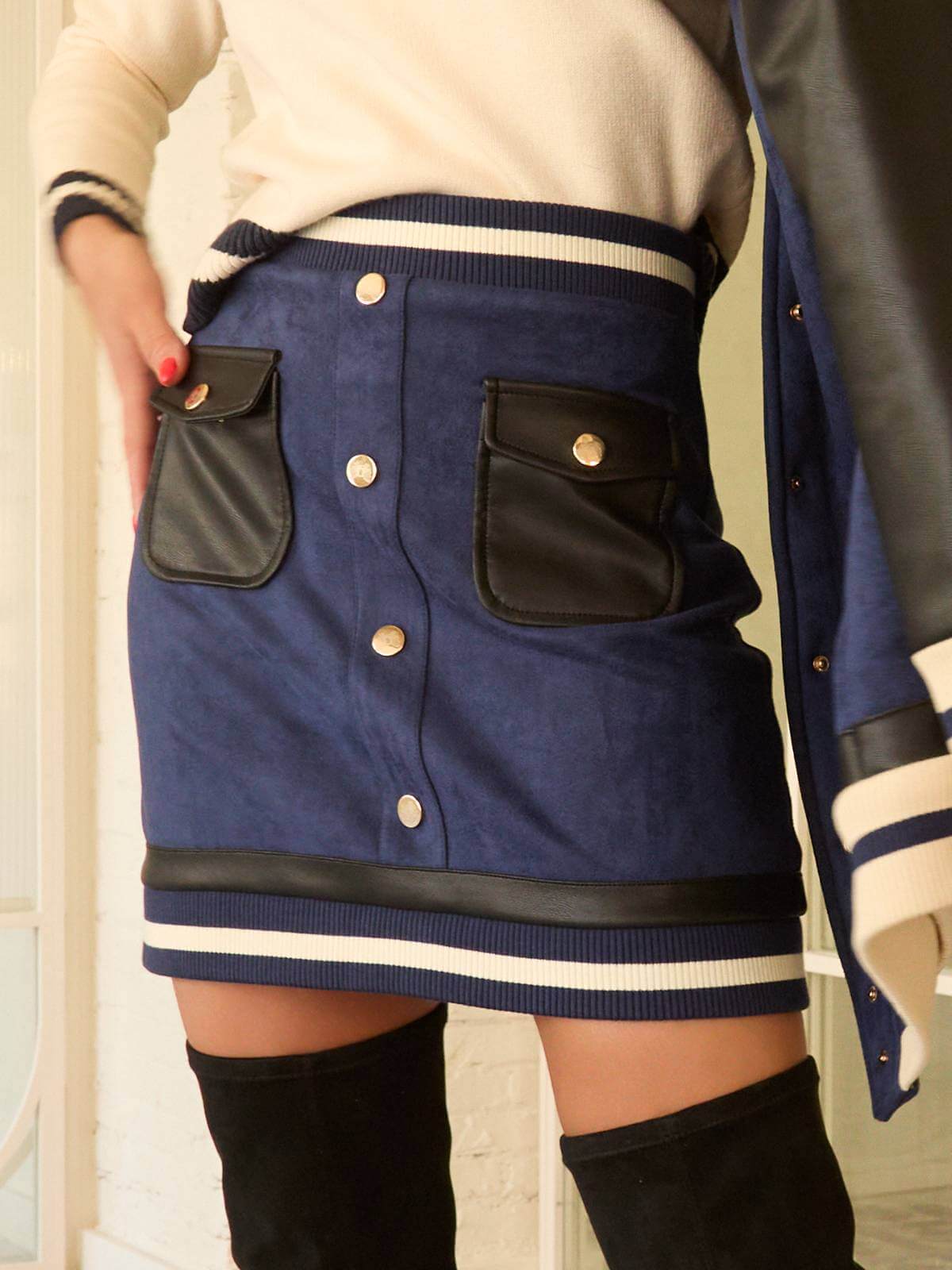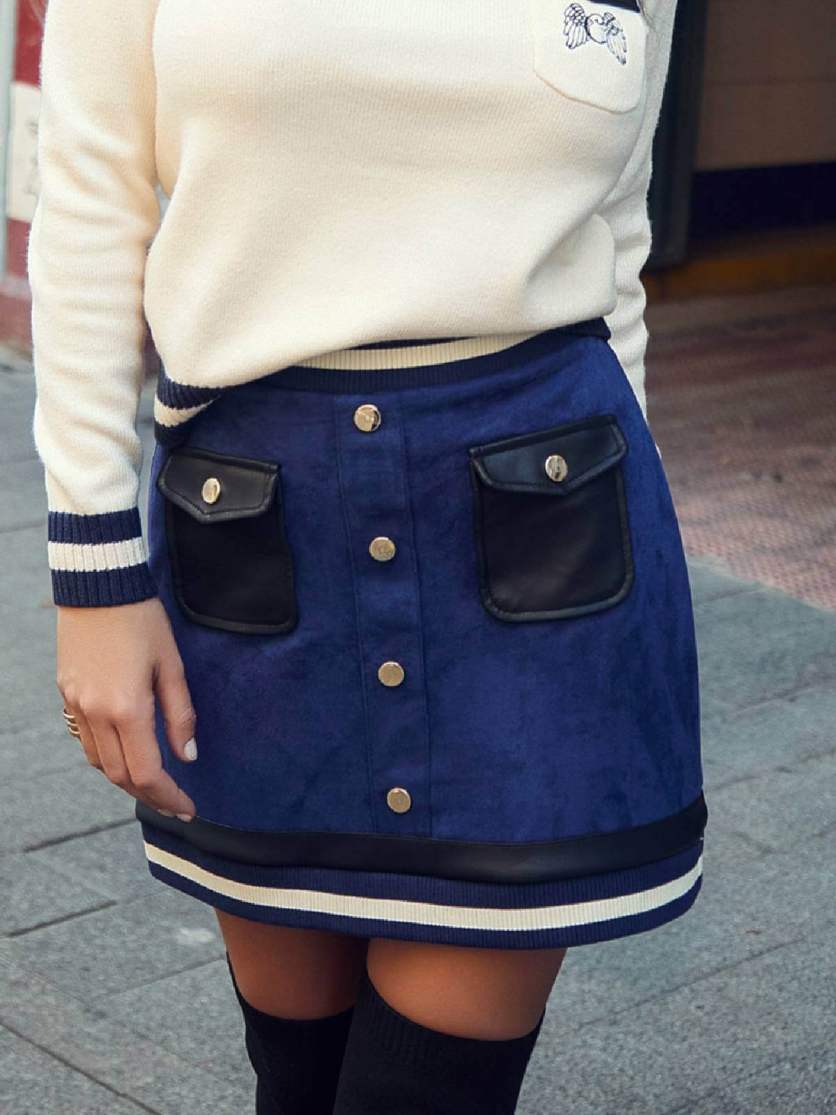 Falda corta de antes azul klein, con doble bolsillo frontal de ecopiel piel en negro. Falsos botones delanteros dorados. Cremallera en la parte trasera. Goma en cintura y bajo en dos colores y detalle ecopiel sobre la goma.