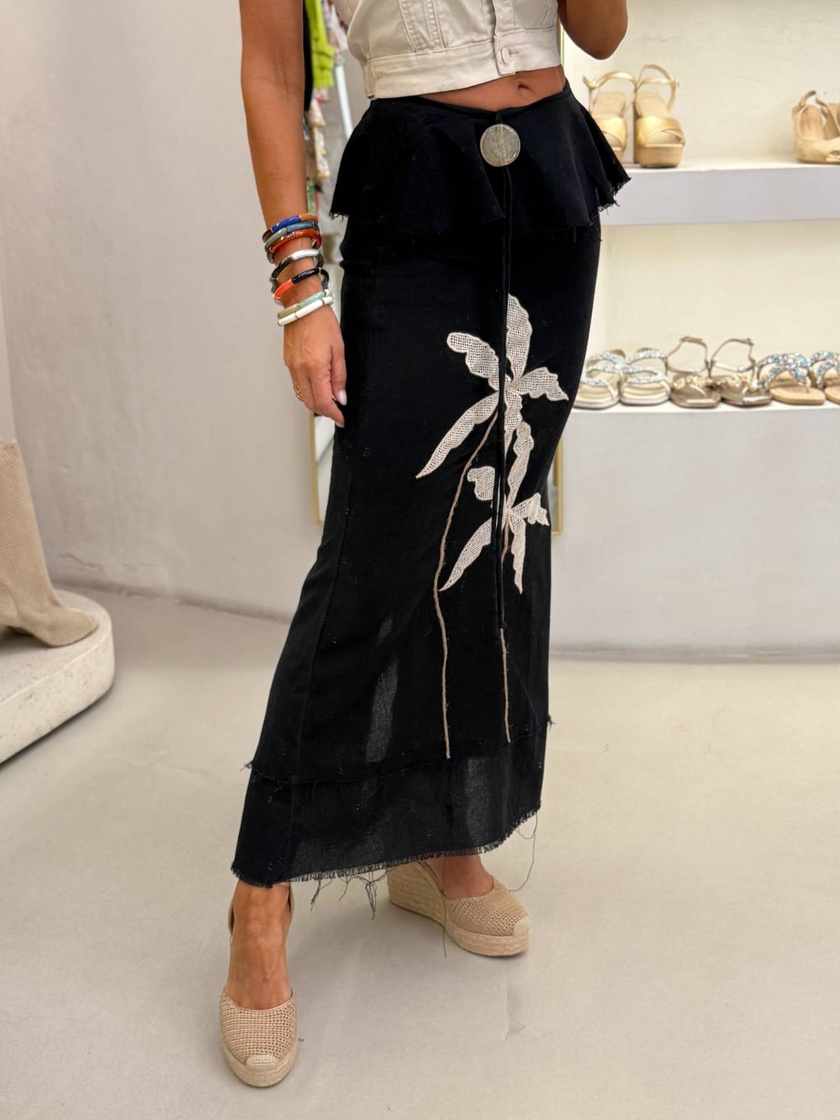 Saia midi preta com cintura franzida e estampa bordada. Composição: 100% algodão.