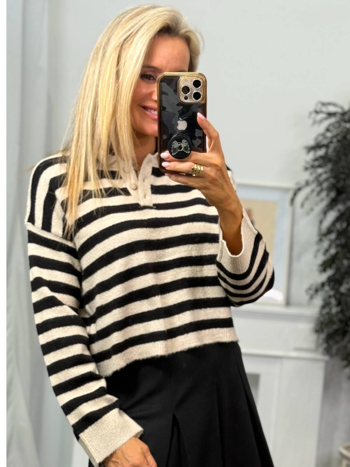 Jersey de punto suave con estampado de rayas negras y beige, con cuello de polo y tapeta de botones. Composición: 72% Acrílico, 26% Poliamida, 3% Elastano.