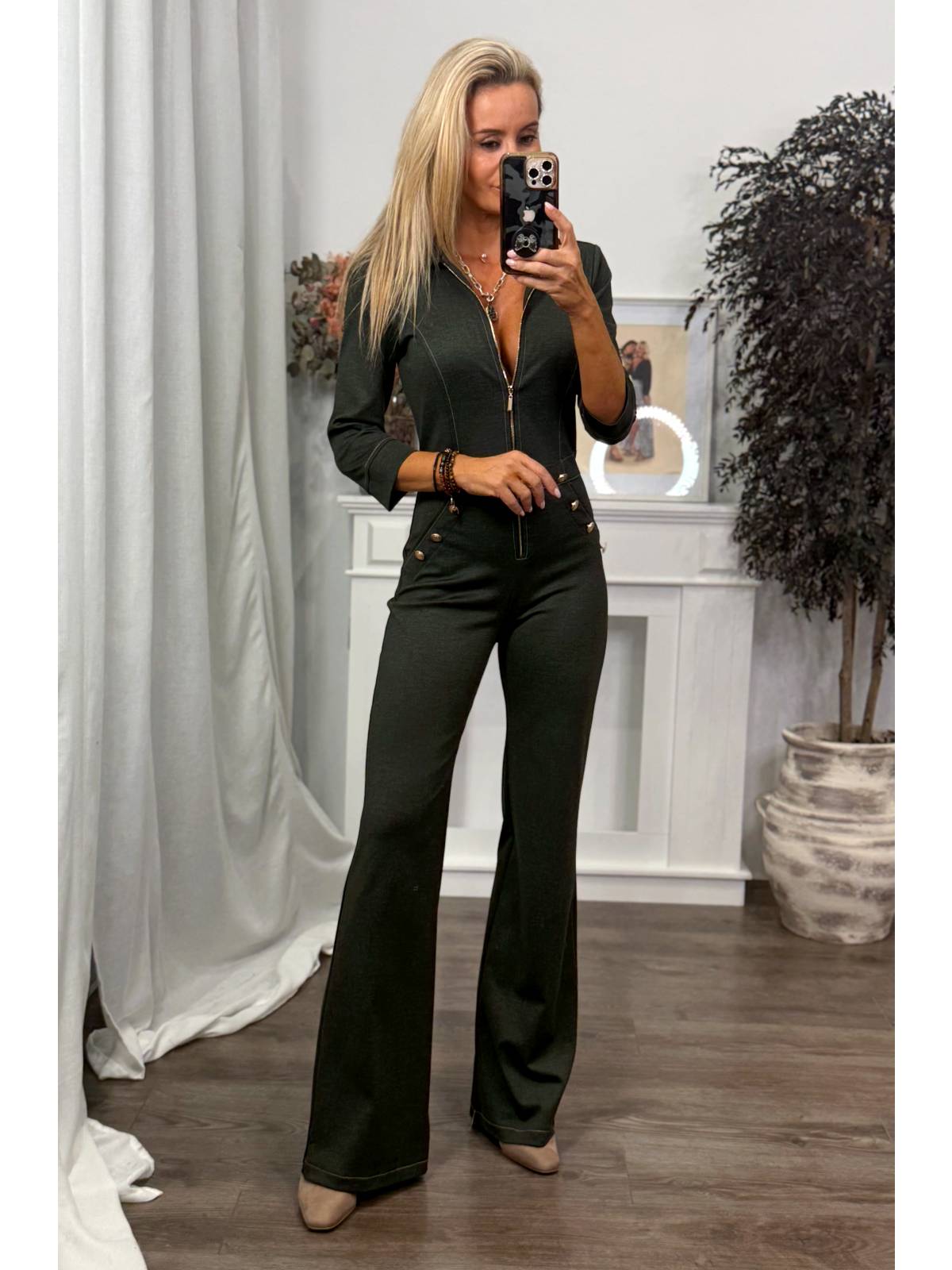 Macacão jeans de pernas largas com costura bege e mangas três-quartos. Fecho de zíper central dourado. Bolsos falsos com detalhes de botões dourados. Tecido elástico. Composição: 57% Poliéster, 38% Viscose, 5% Elastano
