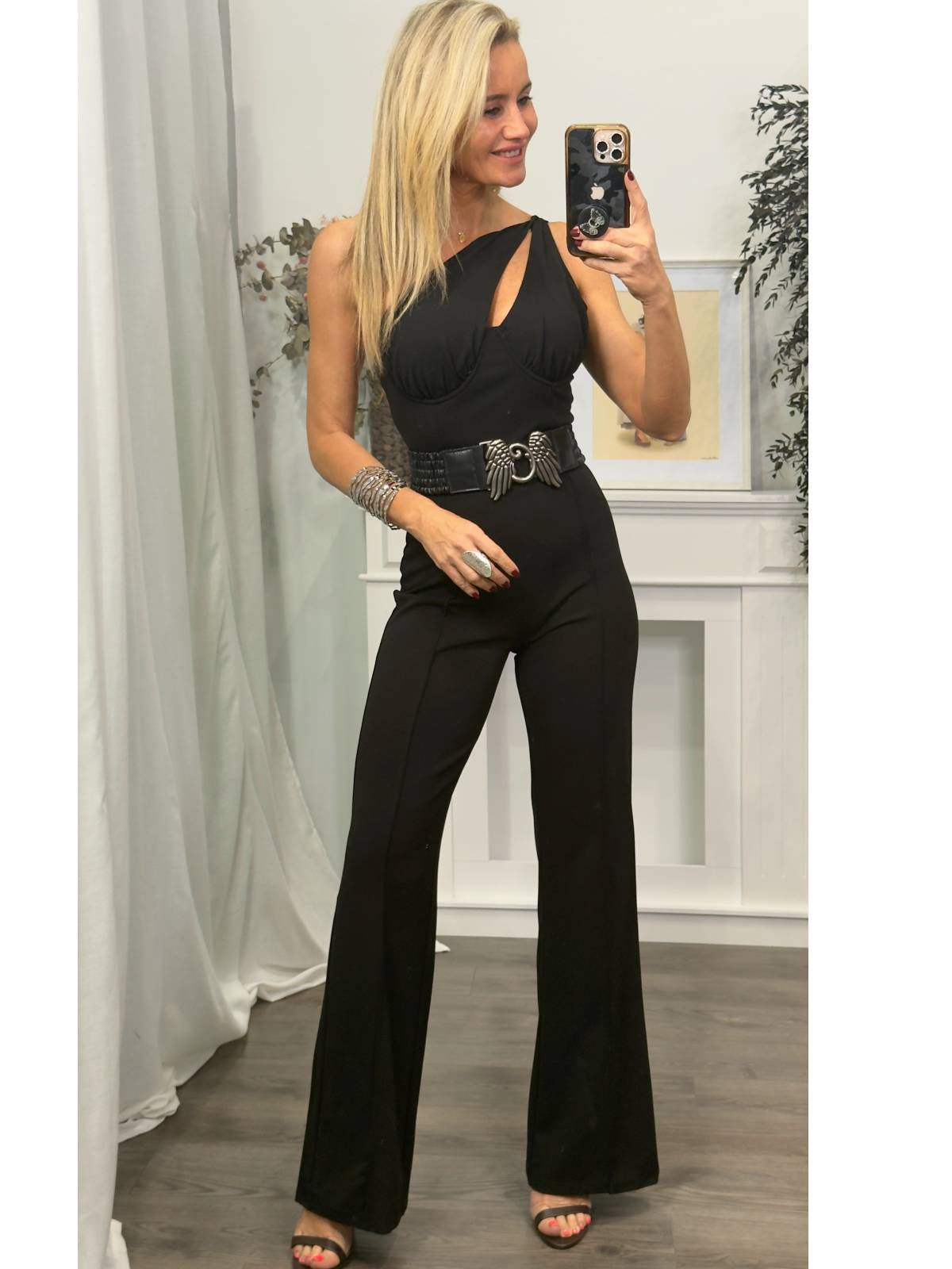 Mono negro largo desmangado con escote asimétrico, aro y cazuela. Cremallera invisible en la parte trasera. Composición: 95% poliéster, 5% spandex.